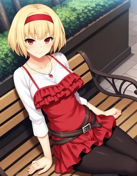 outfit03, 셔츠, 흰색 셔츠, 3/4 소매 셔츠, 라운드 넥 셔츠, 드레스, 빨간 드레스, 프릴 장식 드레스, 짧은 드레스, 벨트, 갈색 벨트, 2바퀴 감긴 벨트, 카프리 바지, 검은 카프리 바지, 목걸이, 장신구 목걸이, 펌프스, 검은 펌프스, 빨간 헤어밴드,