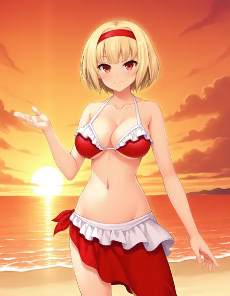 outfit04、ビキニ、レッドのビキニ、ホワイトのフリル付きビキニ、サラング、レッドのサラング、ホワイトのフリル付きサラング、片側結びのサラング、レッドのヘアバンド、