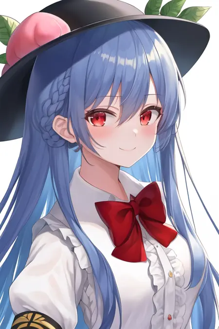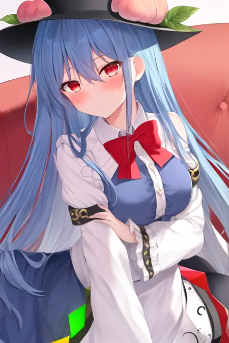 触发词为 hinanawi_tenshi_touhou,推荐标签为:best quality, masterpiece, highres, solo, {hinanawi_tenshi_touhou:1.15}, blue_hair, long_hair, red_eyes, peach, food, fruit, hat, blush, black_headwear, bow, leaf, hair_between_eyes。