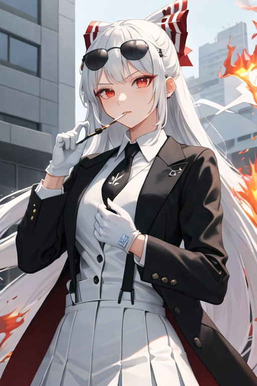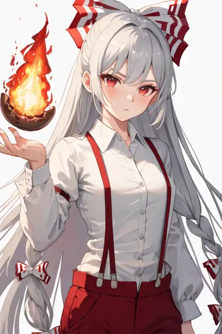 触发词为 fujiwara_no_mokou_touhou,推荐标签为:best quality, masterpiece, highres, solo, {fujiwara_no_mokou_touhou:1.15}, long_hair, bow, hair_bow, red_eyes, white_hair, suspenders, very_long_hair, bangs, white_bow, fire, hair_ribbon。