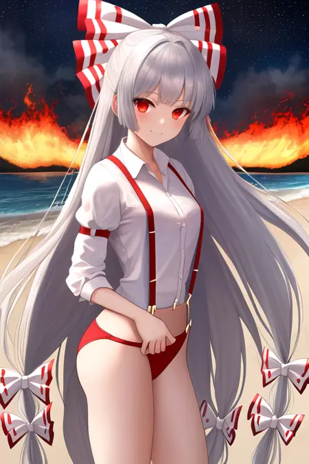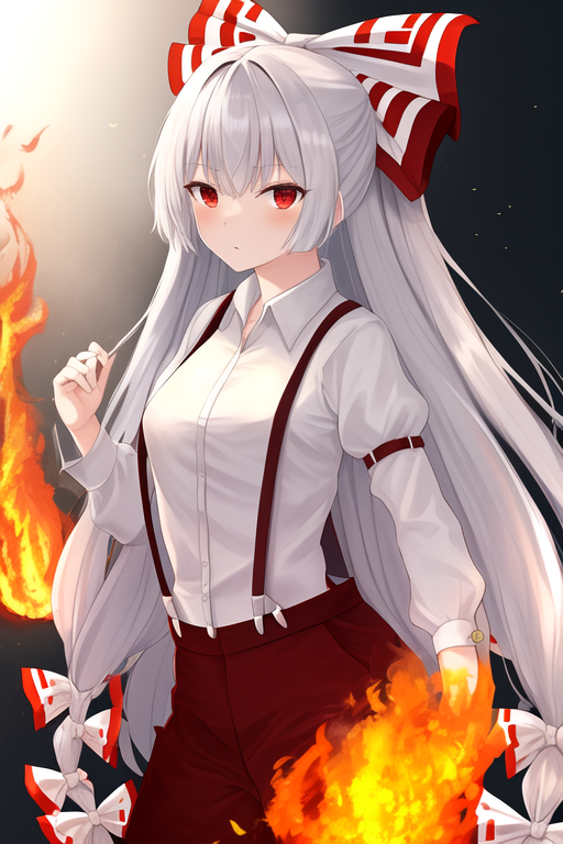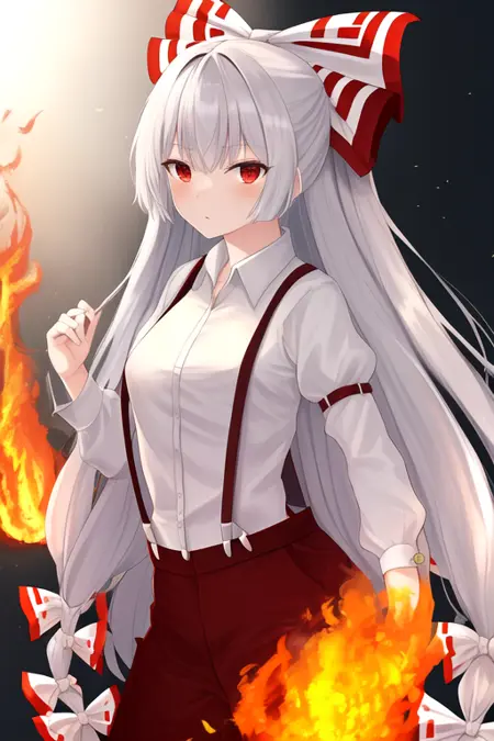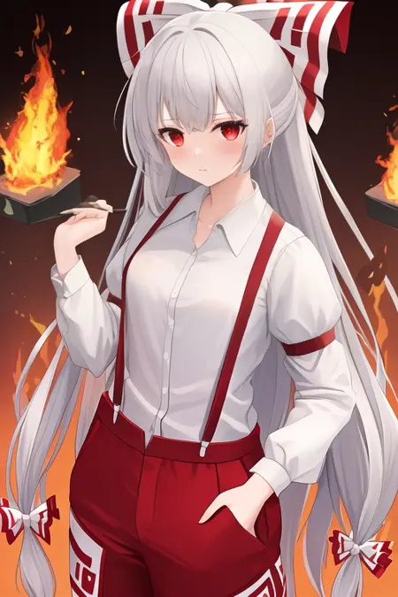 触发词为 fujiwara_no_mokou_touhou,推荐标签为:best quality, masterpiece, highres, solo, {fujiwara_no_mokou_touhou:1.15}, long_hair, bow, hair_bow, red_eyes, white_hair, suspenders, very_long_hair, bangs, white_bow, fire, hair_ribbon。