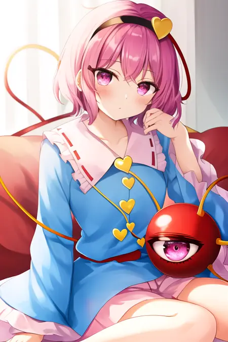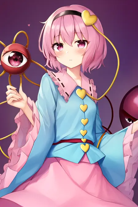 트리거 단어는 komeiji_satori_touhou이며, 권장 태그는 best quality, masterpiece, highres, solo, {komeiji_satori_touhou:1.15}, heart, short_hair, hairband, pink_hair, third_eye, pink_eyes, blush, hair_ornament, heart_hair_ornament입니다.