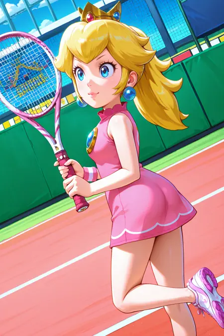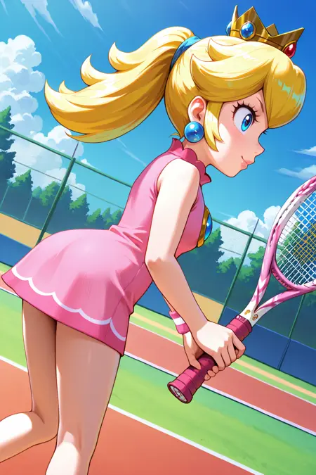 デフォルトの衣装:omsPeachTennis、1girl、単体、青い目、唇、長い髪、ポニーテール、ピンクのドレス、テニスユニフォーム、スポーツウェア、肩出し、リストバンド、靴、袖なしドレス、王冠、ジュエリー、イヤリング