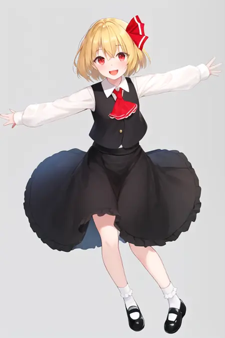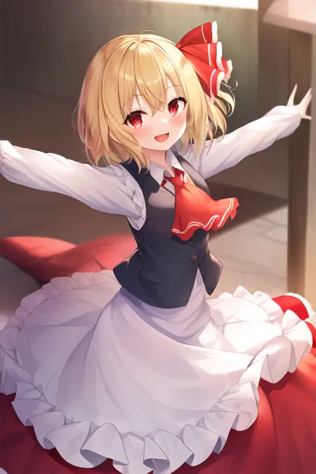The trigger word is rumia_touhou, and the recommended tags are best quality, masterpiece, highres, solo, {rumia_touhou:1.15}, blonde_hair, ribbon, short_hair, hair_ribbon, red_eyes, vest, smile, open_mouth, red_ribbon, ascot.