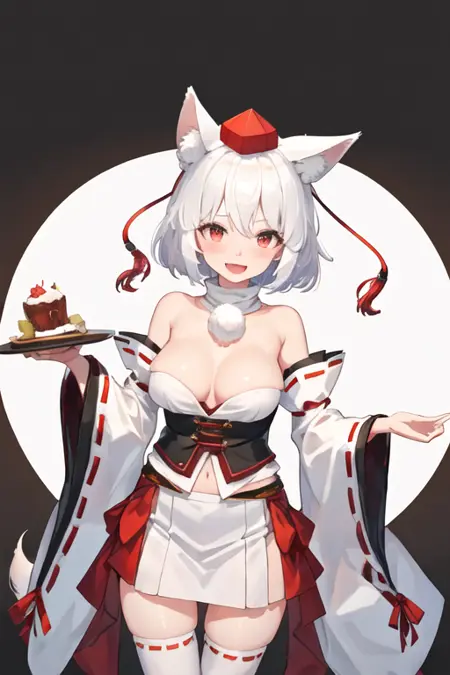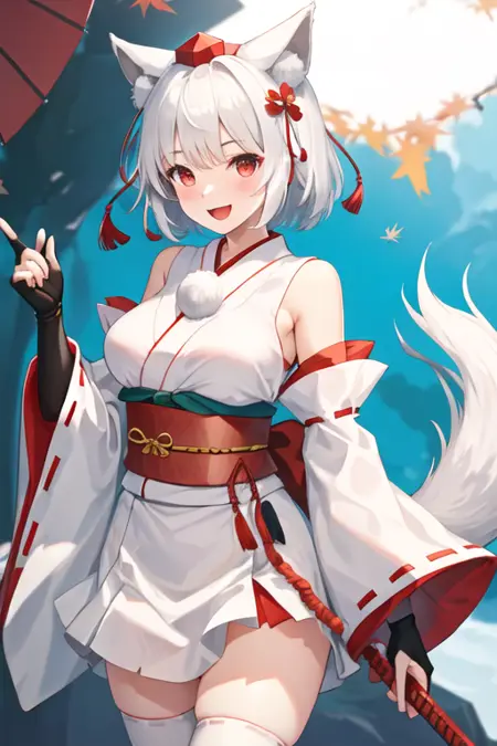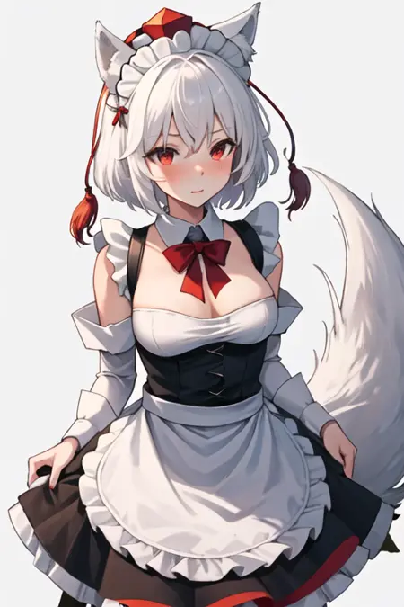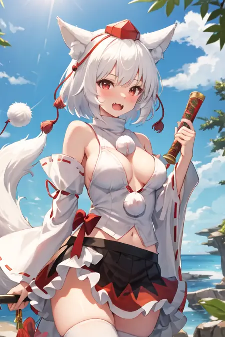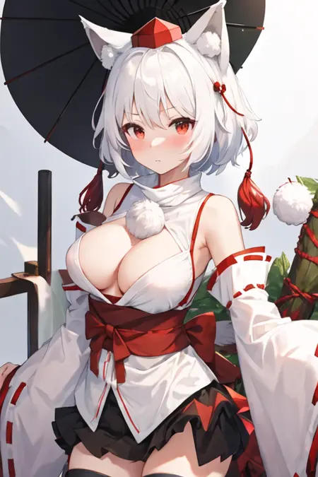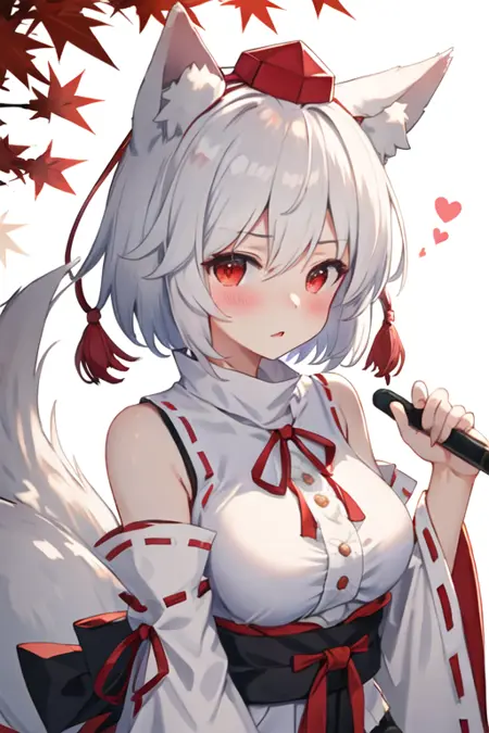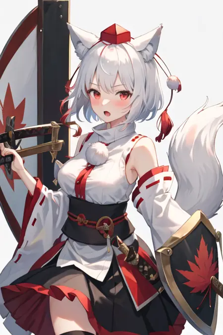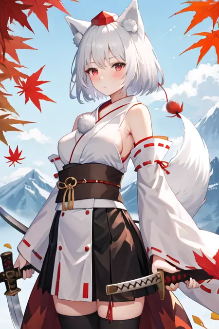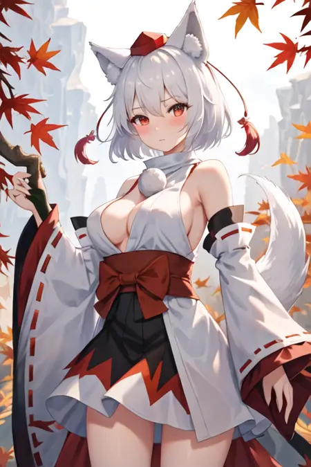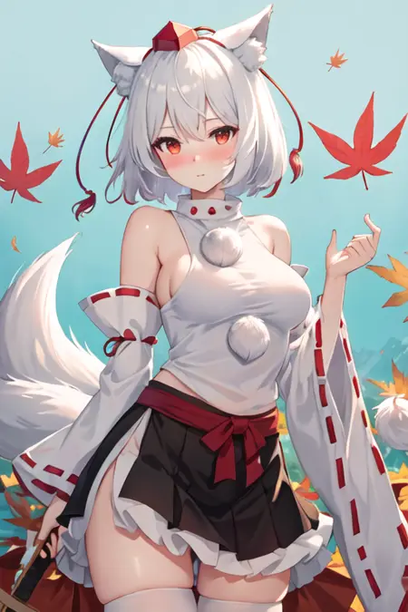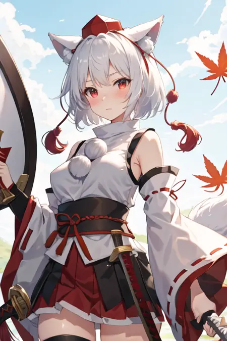 The trigger word is inubashiri_momiji_touhou, and the recommended tags are best quality, masterpiece, highres, solo, {inubashiri_momiji_touhou:1.15}, animal_ears, wolf_ears, short_hair, red_eyes, white_hair, hat, tokin_hat, wolf_tail, tail, blush, breasts.