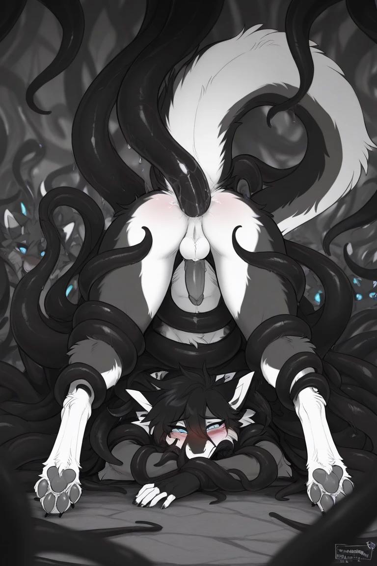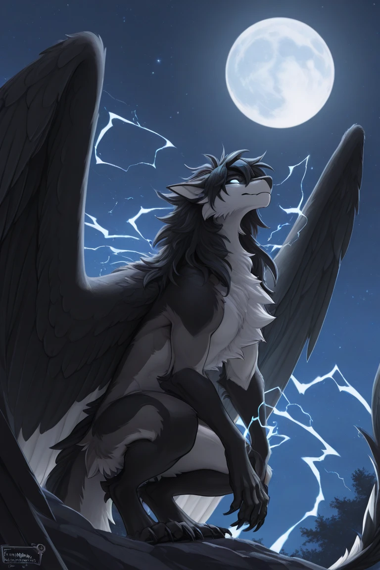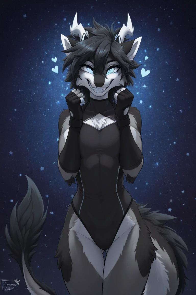 EnderMoonfur, furry, furred dragon, blue horns, blue eyes, two-toned fur, black fur, white body, wings, feathered wings, long tail