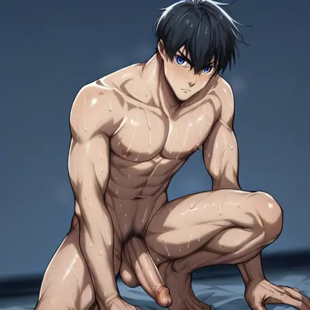 "sweat, glowing eyes, blue around eyes, topless male"