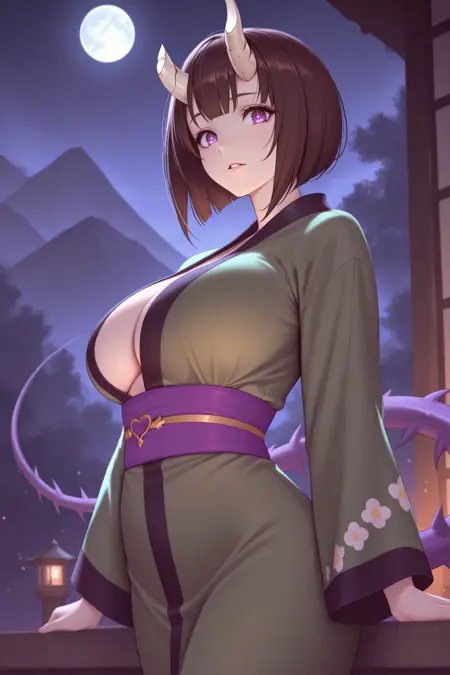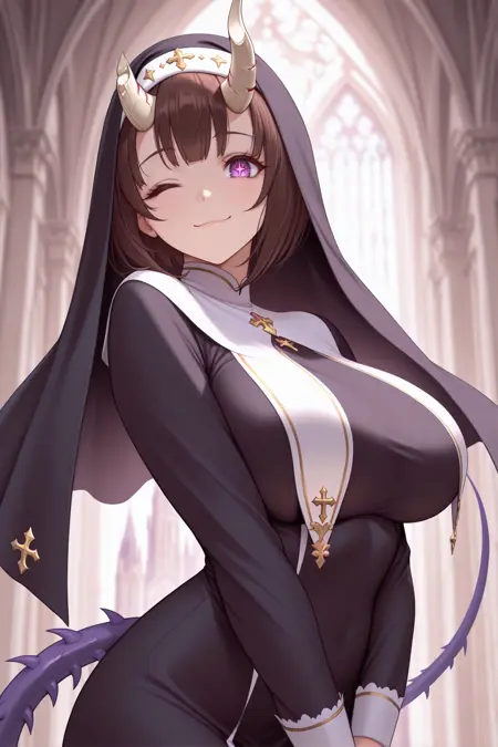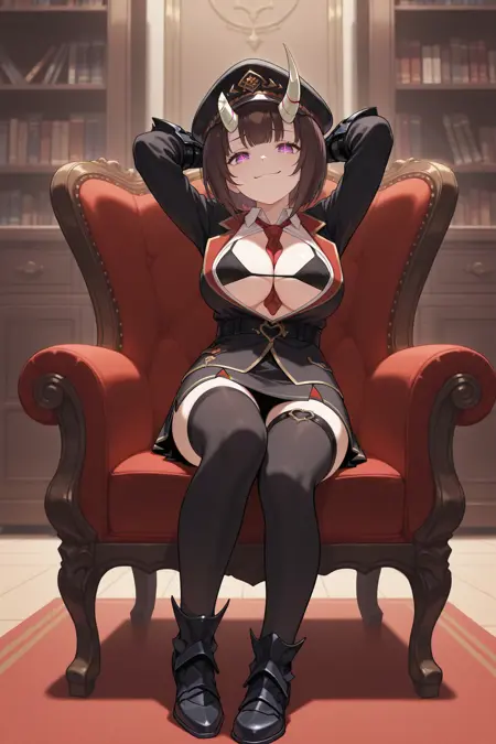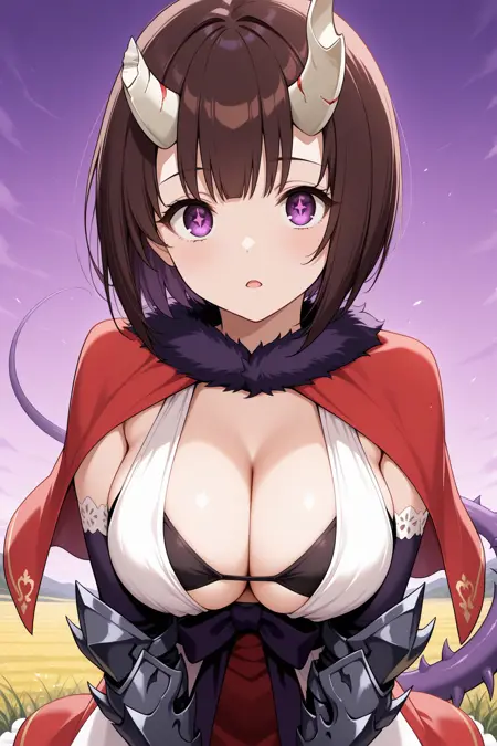 通常姿には「baseer, brown hair, short hair, bob cut, broken horn, demon horns, purple eyes, symbol-shaped pupils, large breasts, red capelet, white dress, sleeveless, black bra, cleavage, fur trim, red skirt, fur-trimmed skirt, gauntlets, armored boots」を追加してください。
