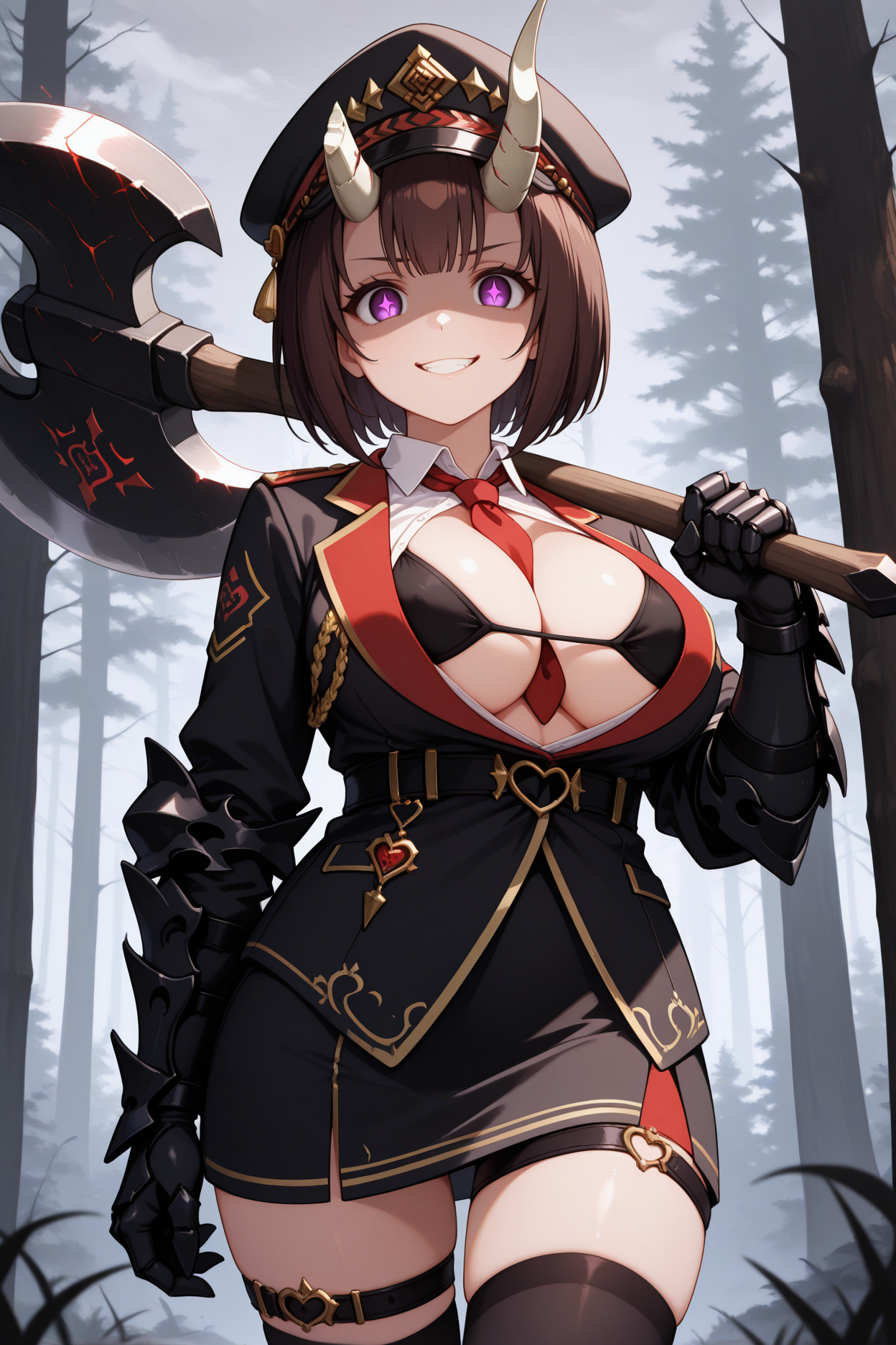 コマンダーアルトには「cdrer, brown hair, short hair, bob cut, broken horn, demon horns, purple eyes, symbol-shaped pupils, large breasts, peaked cap, black hat, black jacket, collared shirt, red necktie, necktie between breasts, black gauntlets, black bra, black skirt, thigh strap, black thighhighs」を追加してください。