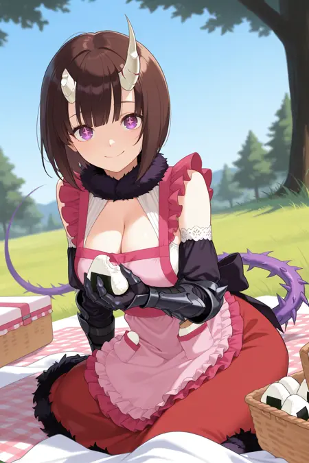 バレンタインアルトには「vlter, brown hair, short hair, bob cut, broken horn, demon horns, purple eyes, symbol-shaped pupils, large breasts, fur collar, pink apron, frilled apron, cleavage, red skirt, fur trim, gauntlets」を追加してください。(「red skirt, fur trim」を「naked apron」に置き換えると、ノーパンのエプロンになります…)