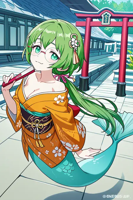 외모: 녹색 머리카락, 녹색 눈, 긴 머리카락, 단발머리, 헤어 리본, 안경, 중간 크기의 가슴, 몬스터 걸, 인어, 인어 꼬리, 녹색 꼬리