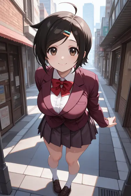 如需展现她典型的造型,请添加 "深红色西装外套、红色蝴蝶结、百褶裙"。
