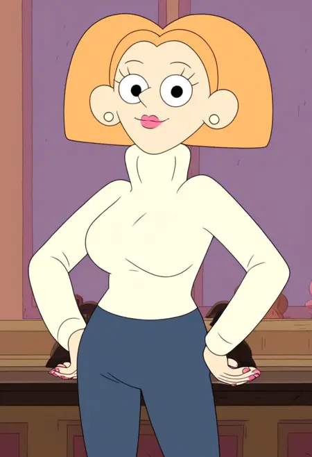服装: 米色高领毛衣,深蓝色长裤,黑色平底鞋
