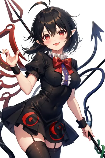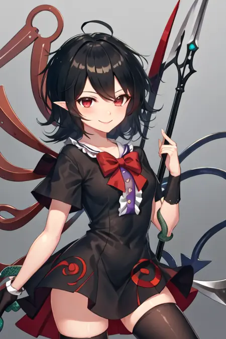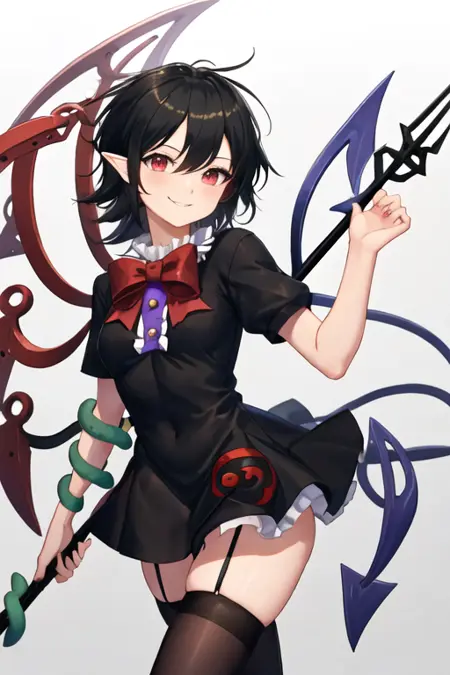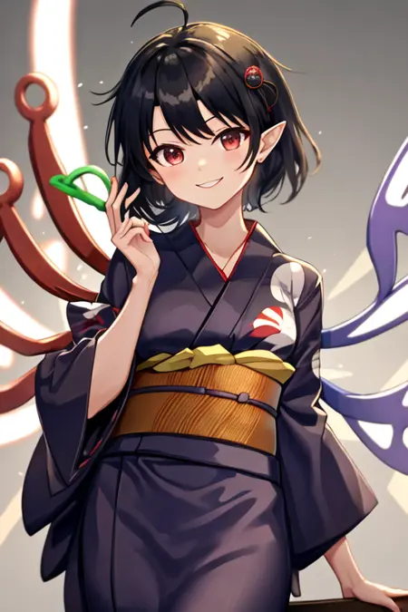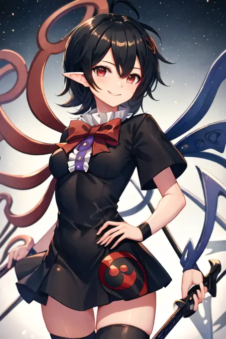 The trigger word is houjuu_nue_touhou, and the recommended tags are best quality, masterpiece, highres, solo, {houjuu_nue_touhou:1.15}, black_hair, wings, asymmetrical_wings, red_eyes, short_hair, bow, smile.