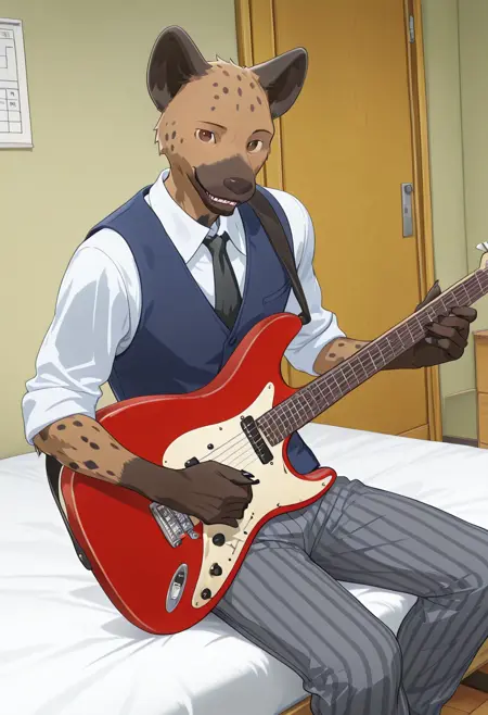 Miguno, 1boy, mature male, male, slender build, anthro, spotted hyena, animal ears, brown eyes, brown and black fur