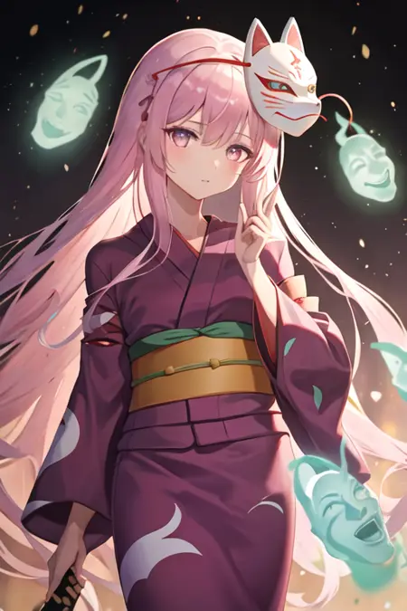 The trigger word is hata_no_kokoro_touhou, and the recommended tags are best quality, masterpiece, highres, solo, {hata_no_kokoro_touhou:1.15}, long_hair, pink_hair, pink_eyes, plaid, bow, expressionless, bangs, bowtie, very_long_hair, hair_between_eyes.