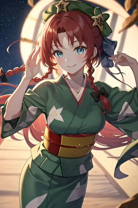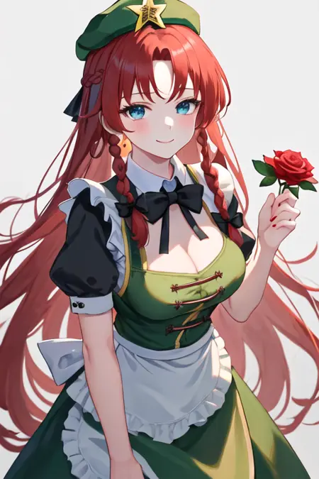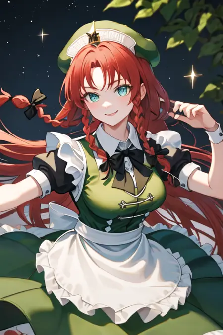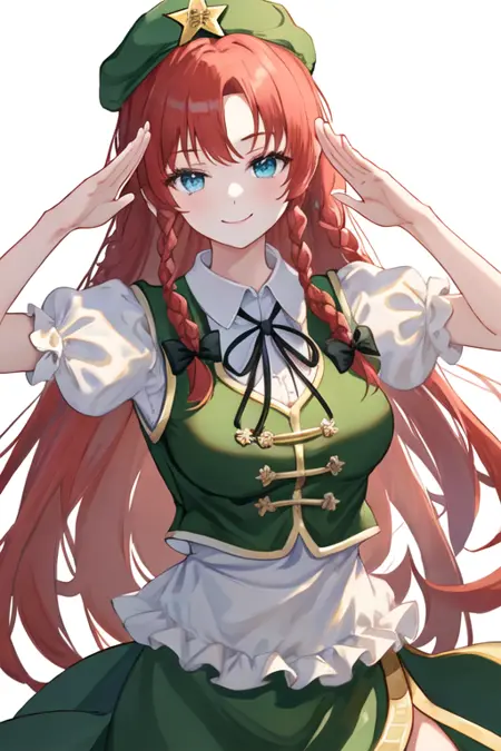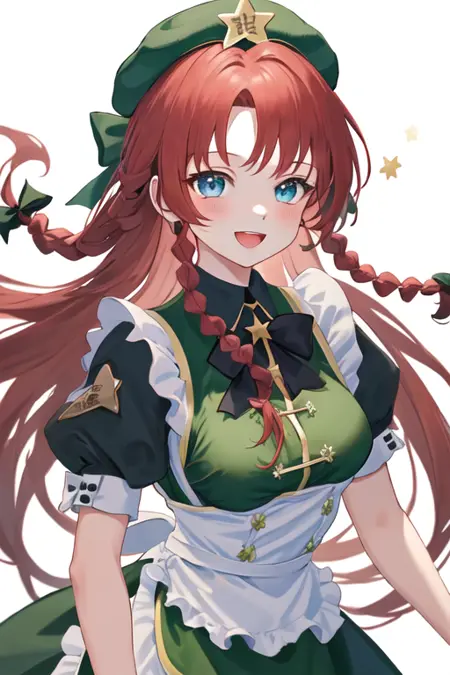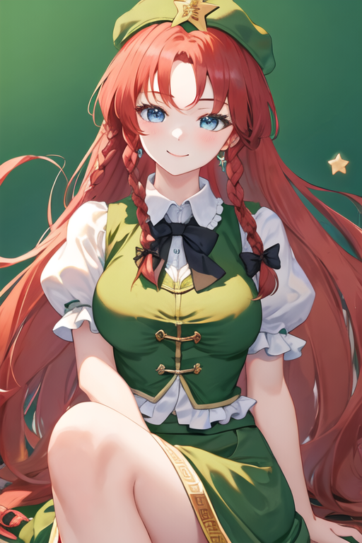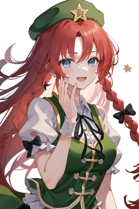 The trigger word is hong_meiling_touhou, and the recommended tags are best quality, masterpiece, highres, solo, {hong_meiling_touhou:1.15}, braid, long_hair, red_hair, twin_braids, star_\(symbol\), hat, hat_ornament, star_hat_ornament, beret, smile, bow, bangs, blue_eyes, breasts, hair_bow, ribbon, green_headwear, green_eyes.