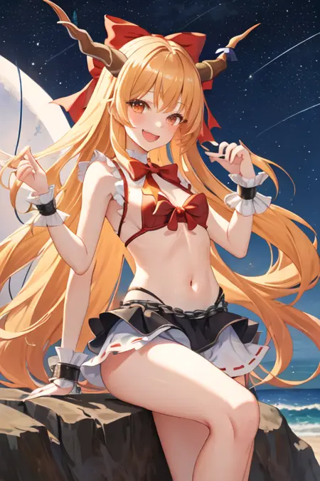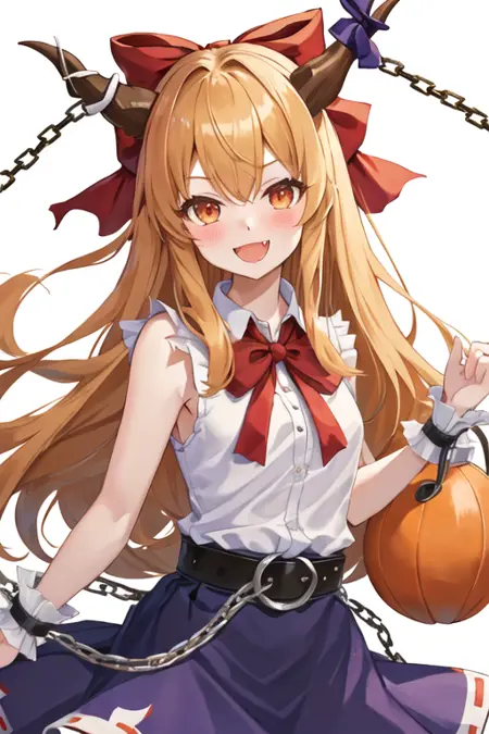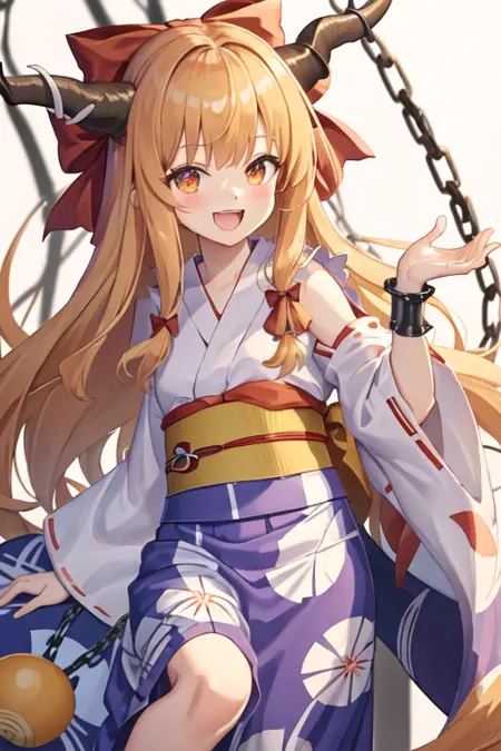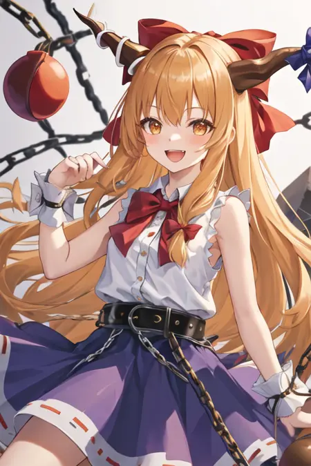触发词为 ibuki_suika_touhou,推荐标签为:best quality, masterpiece, highres, solo, {ibuki_suika_touhou:1.15}, horns, bow, long_hair, hair_bow, ribbon, horn_ornament, sleeveless, horn_ribbon, smile, orange_hair, red_bow, chain, wrist_cuffs, bangs, open_mouth, very_long_hair, blonde_hair。