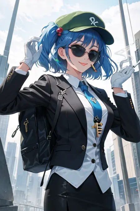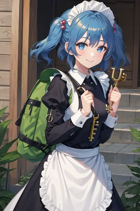 The trigger word is kawashiro_nitori_touhou, and the recommended tags are best quality, masterpiece, highres, solo, {kawashiro_nitori_touhou:1.15}, blue_hair, hair_ornament, hair_bobbles, two_side_up, blue_eyes, hat, short_hair, key, smile, bag, backpack.