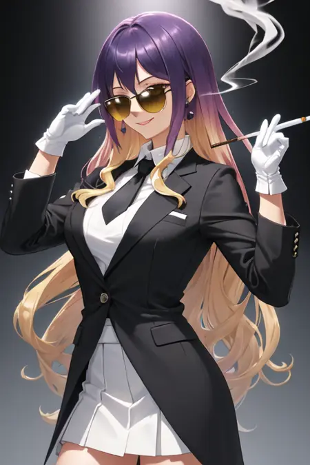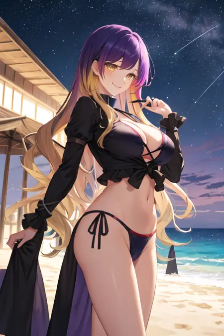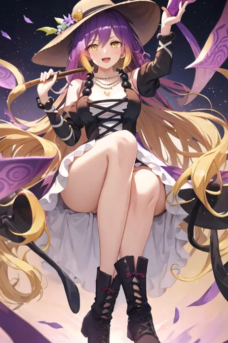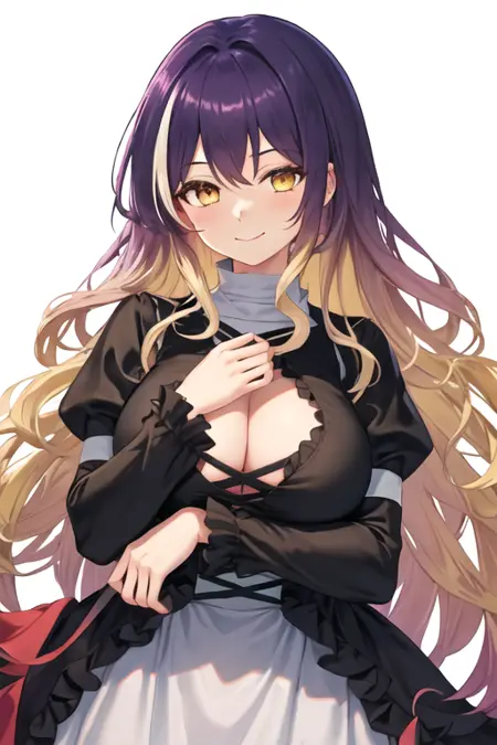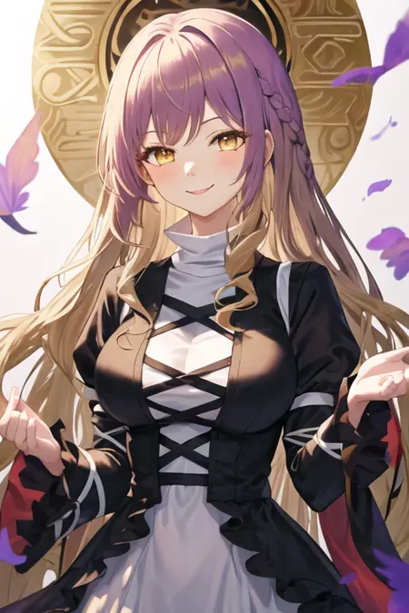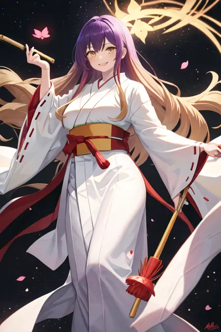 触发词为 hijiri_byakuren_touhou,推荐标签为:best quality, masterpiece, highres, solo, {hijiri_byakuren_touhou:1.15}, multicolored_hair, gradient_hair, long_hair, purple_hair, blonde_hair, yellow_eyes, smile, brown_hair, breasts。