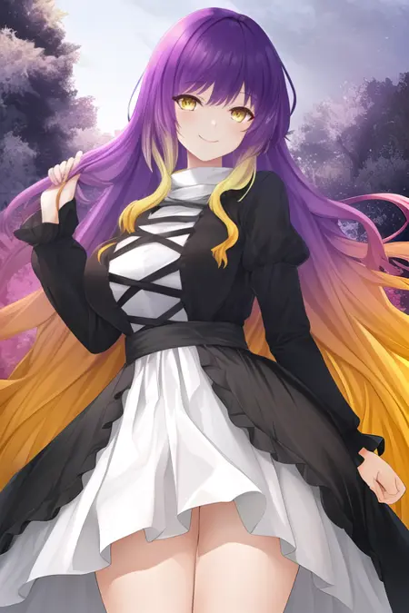 The trigger word is hijiri_byakuren_touhou, and the recommended tags are best quality, masterpiece, highres, solo, {hijiri_byakuren_touhou:1.15}, multicolored_hair, gradient_hair, long_hair, purple_hair, blonde_hair, yellow_eyes, smile, brown_hair, breasts.