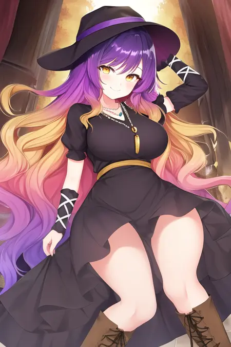 The trigger word is hijiri_byakuren_touhou, and the recommended tags are best quality, masterpiece, highres, solo, {hijiri_byakuren_touhou:1.15}, multicolored_hair, gradient_hair, long_hair, purple_hair, blonde_hair, yellow_eyes, smile, brown_hair, breasts.
