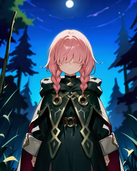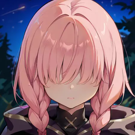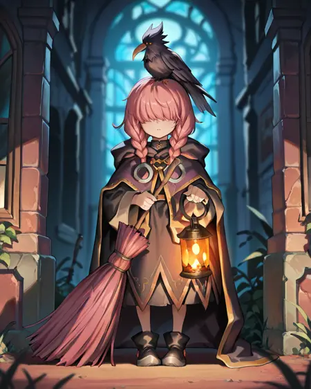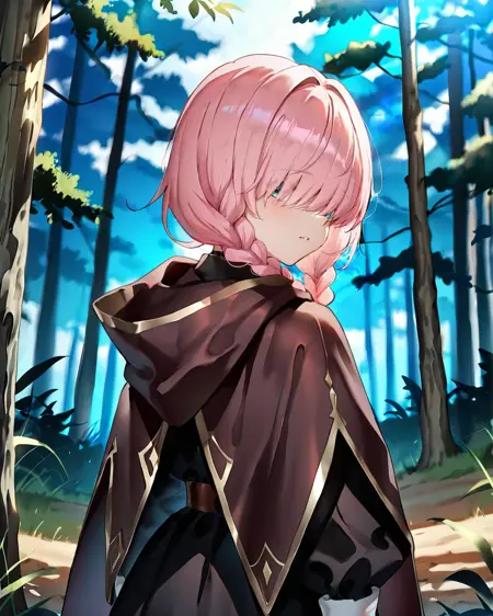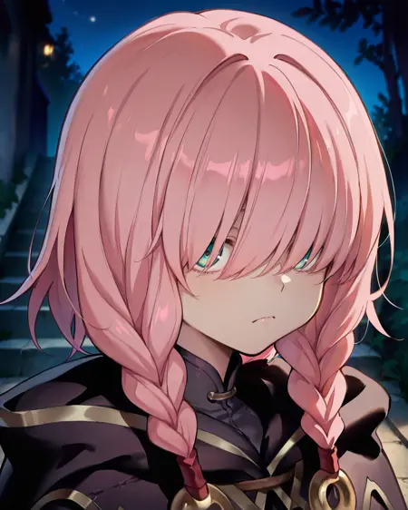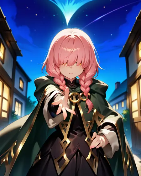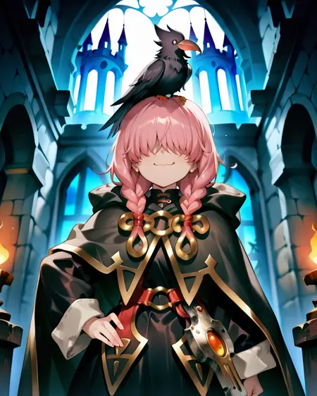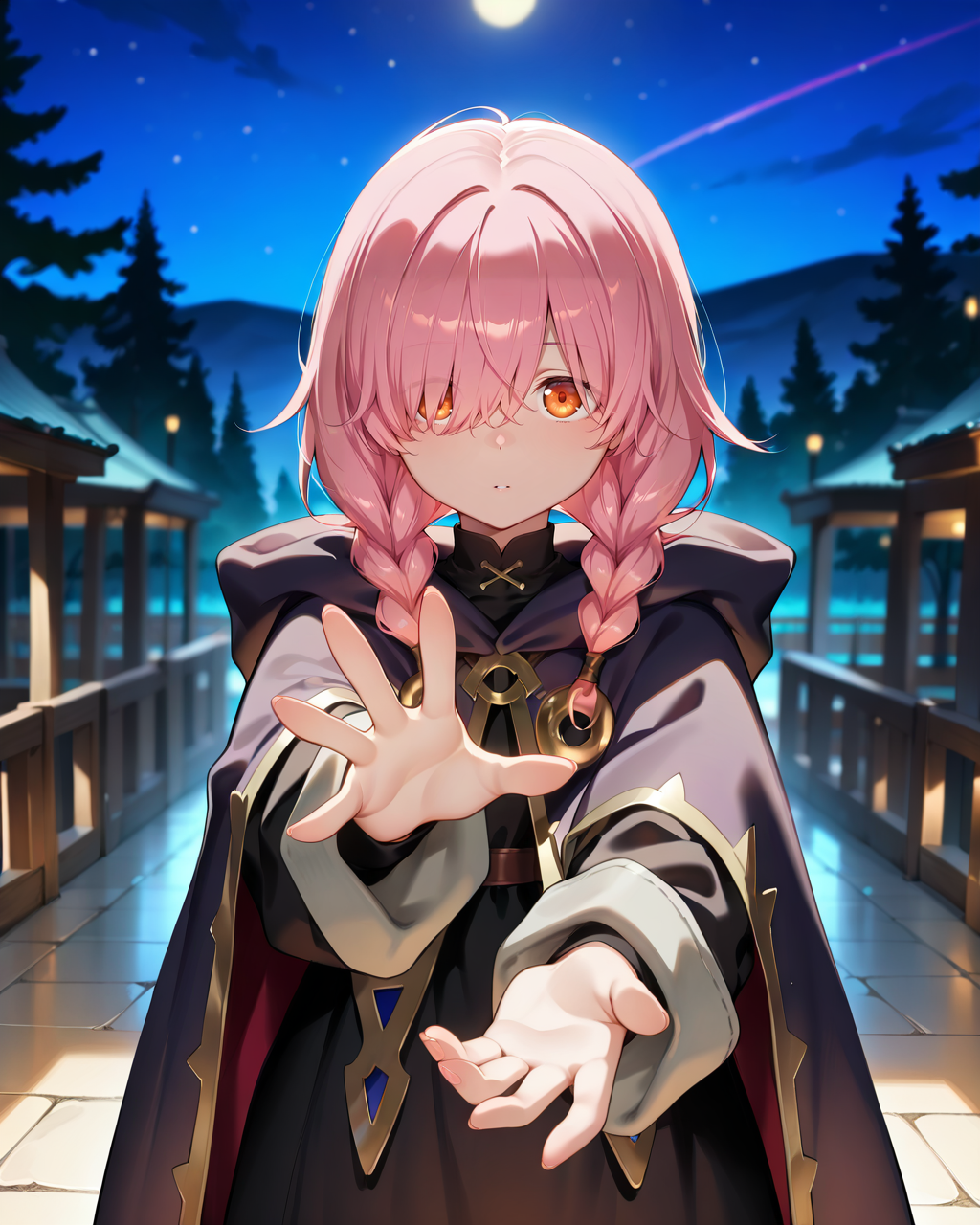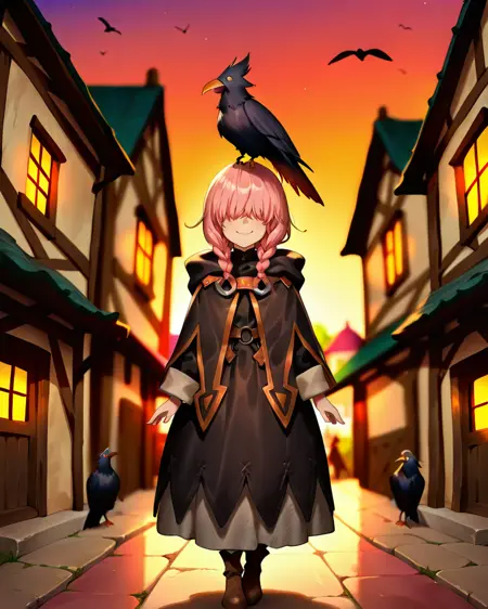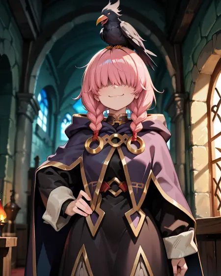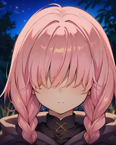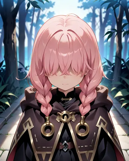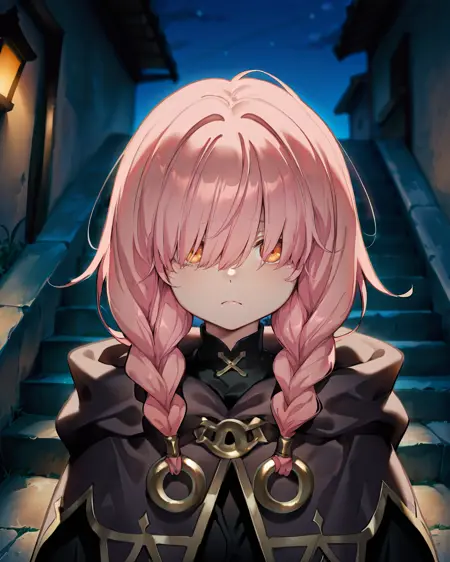 役立つタグ: 1girl、ツインビーズ、ロングヘア、髪で目を隠した、目が隠れた、ピンクヘア、フード付きマント、フードを下ろした、黒いドレス、黒い靴