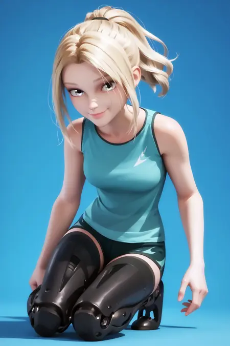 Prompts : 1girl, blonde hair, ponytail, prosthetic legs, grey eyes, blue eyes, long hair