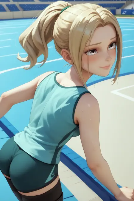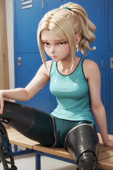 Sublime Prompts : 1girl, blonde hair, ponytail, grey eyes, blue eyes, prosthetic legs, long hair, bare thighs