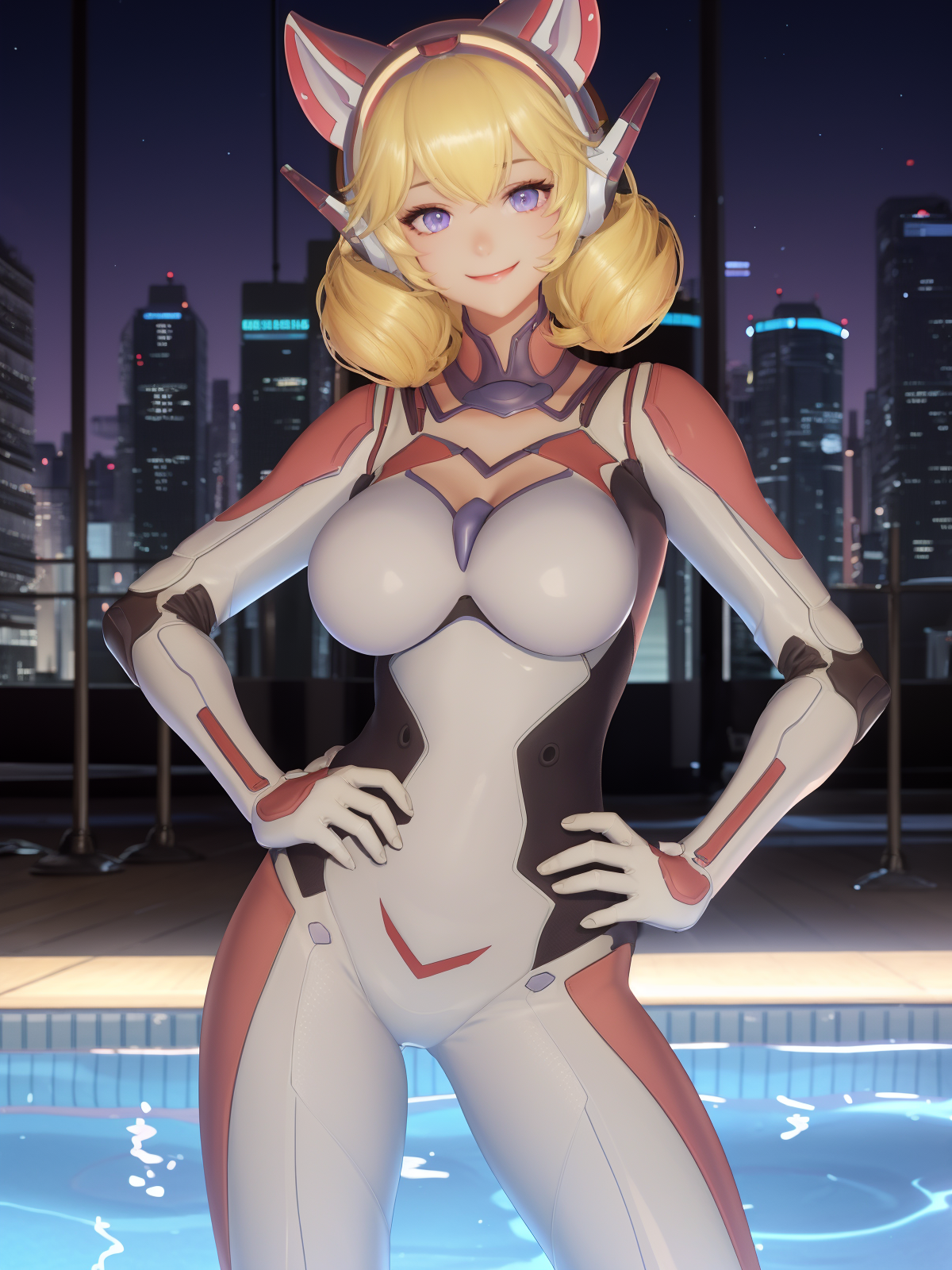 - WZRYdajiBSZR, 1girl, solo, blonde hair,bodysuit, breasts, looking at viewer,purple eyes,bangs, medium hair,clothing cutout,hair between eyes, medium breasts,fake animal ears,cityscape, night, mature female, pool, smile,
