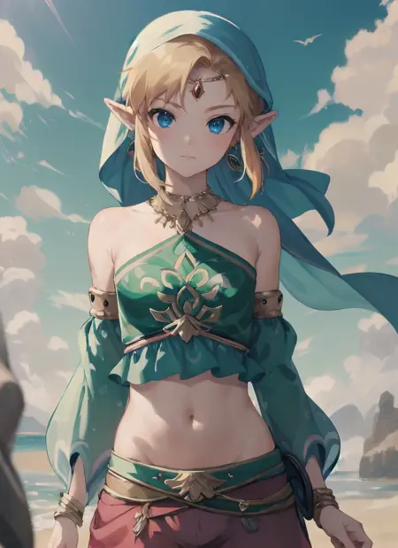 Prompts are components of clothing: crop top, detached sleeves, veil, mouth veil, harem pants
