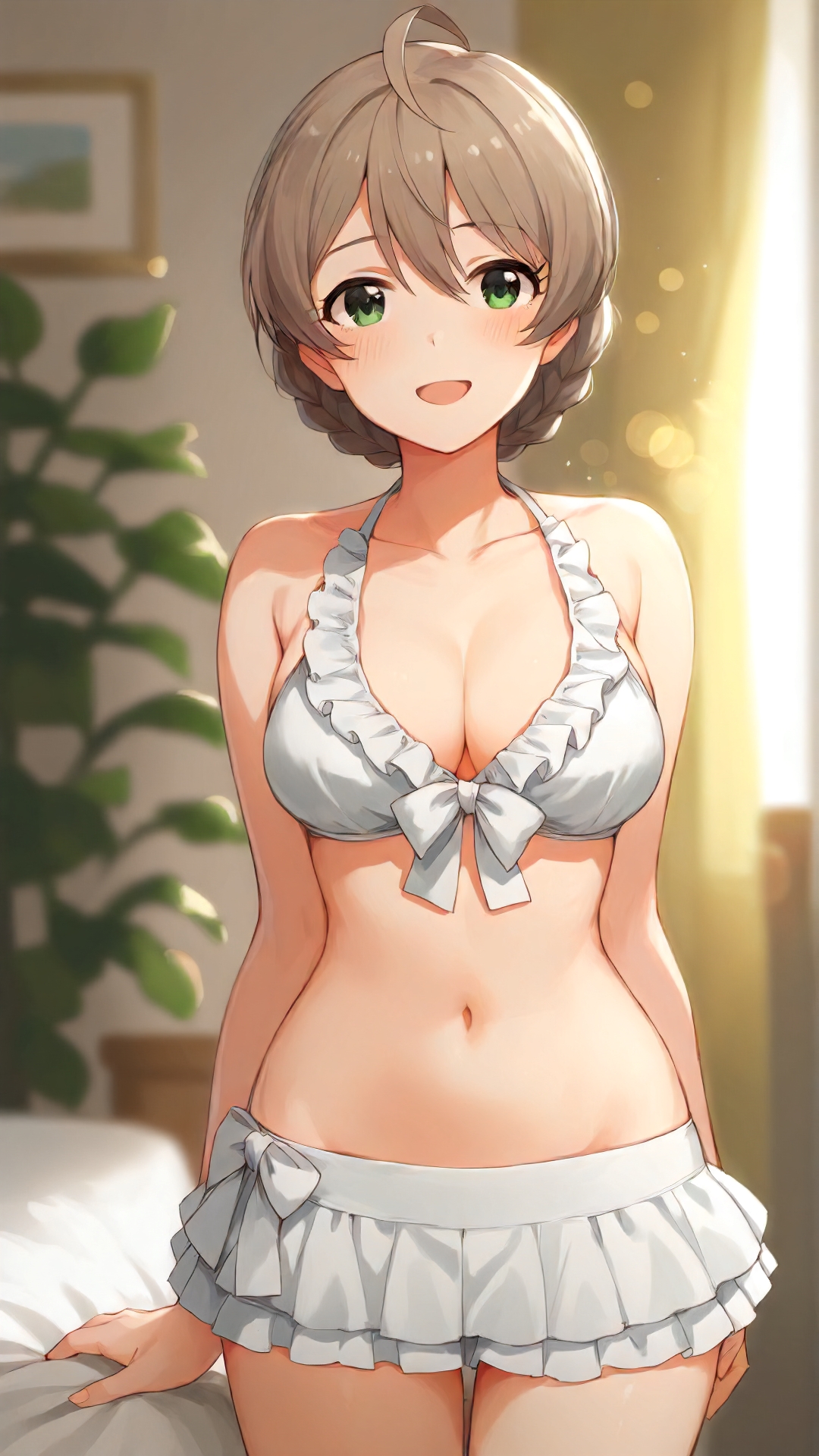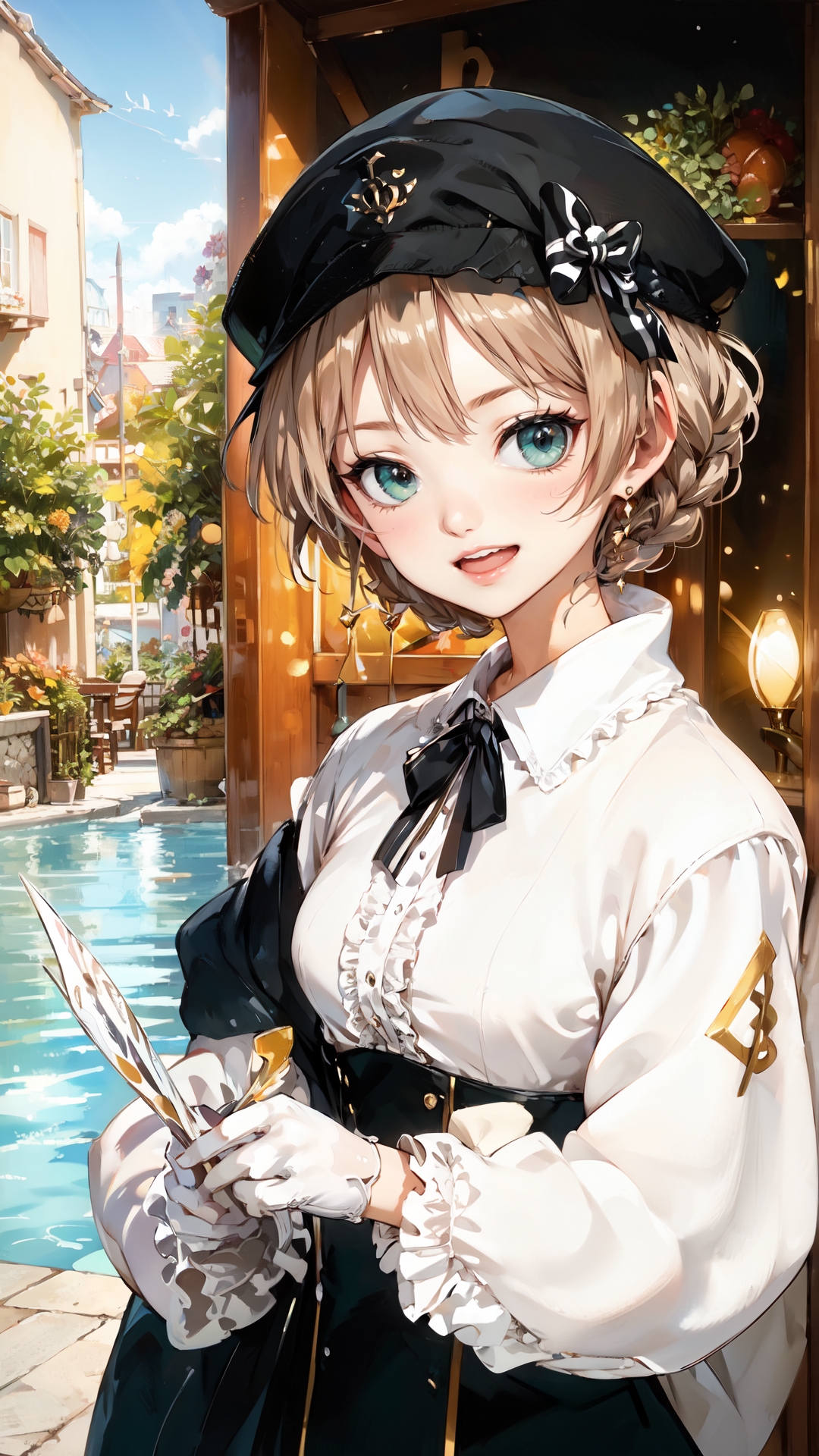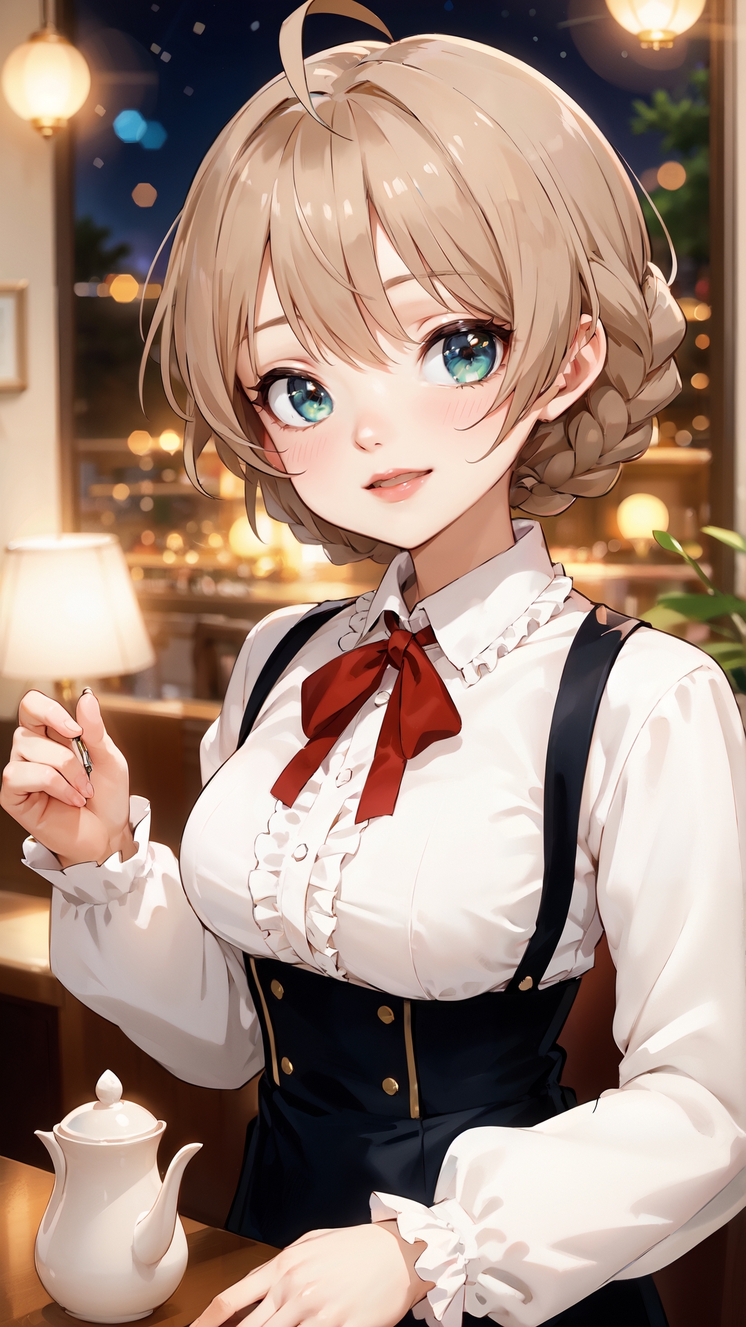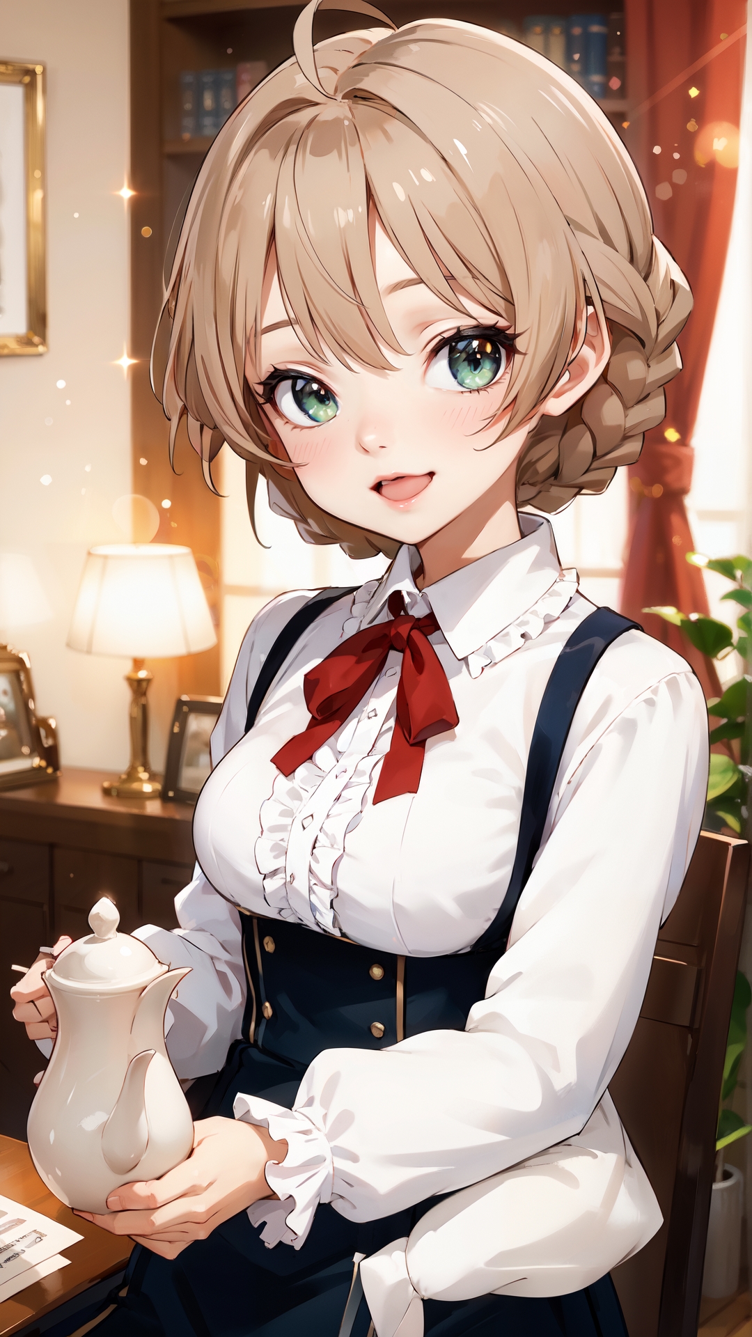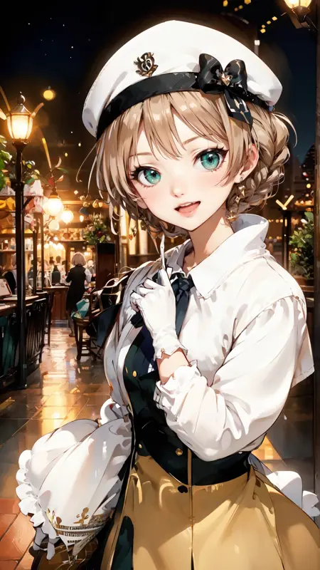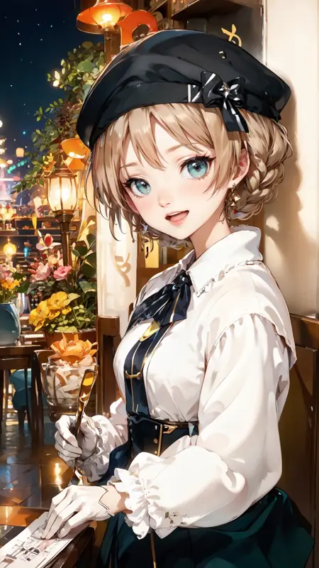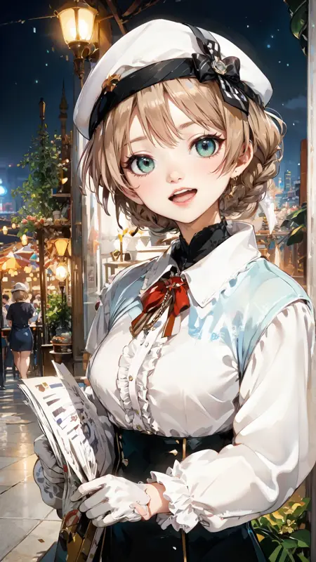 Example prompt : "sakuramori_kaori_idolmaster, an anime girl, 1girl, solo, looking at viewer, smile, short hair, open mouth, gloves, hat, green eyes, braid, white gloves, light brown hair, treble clef, musical note print"