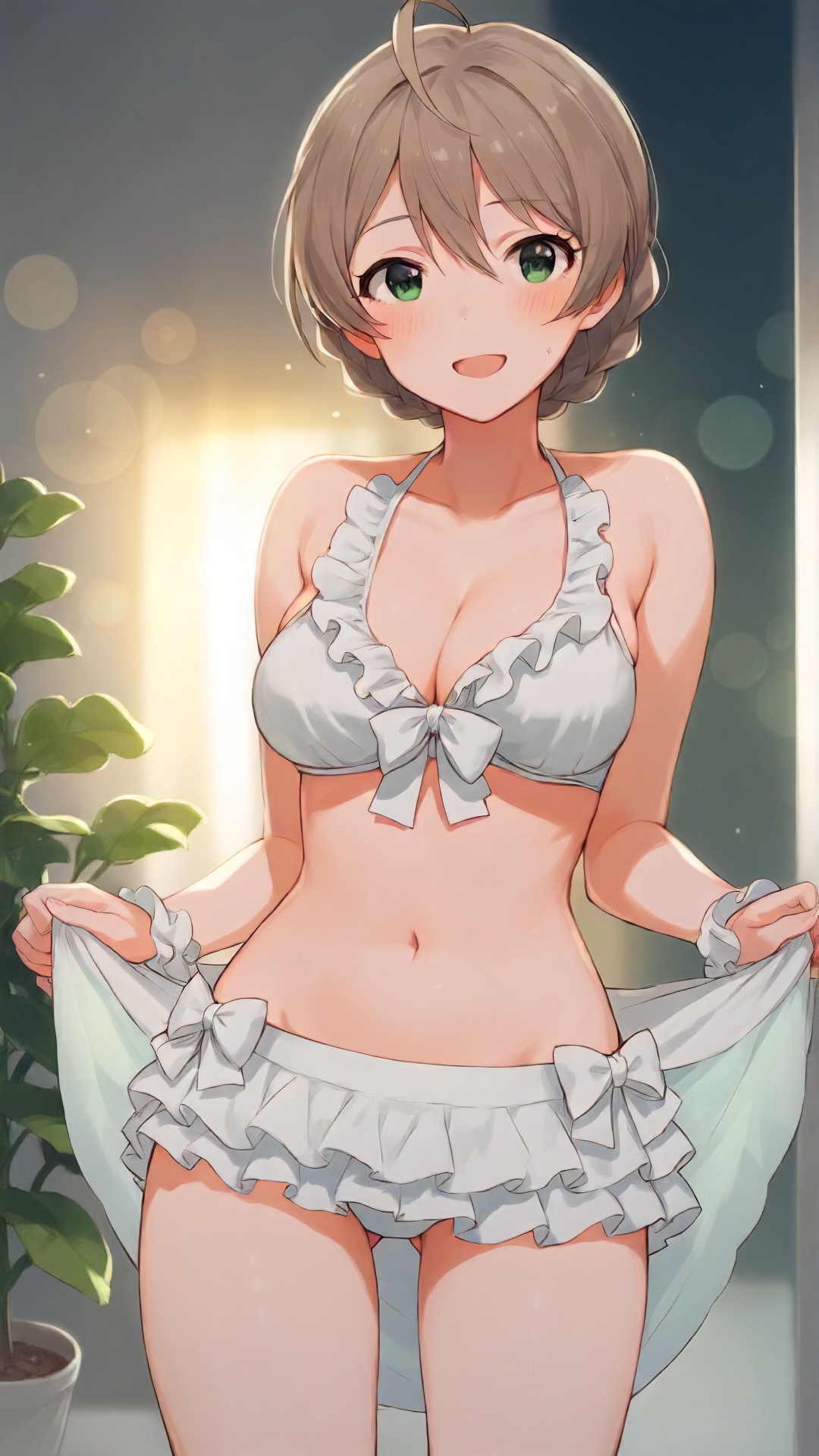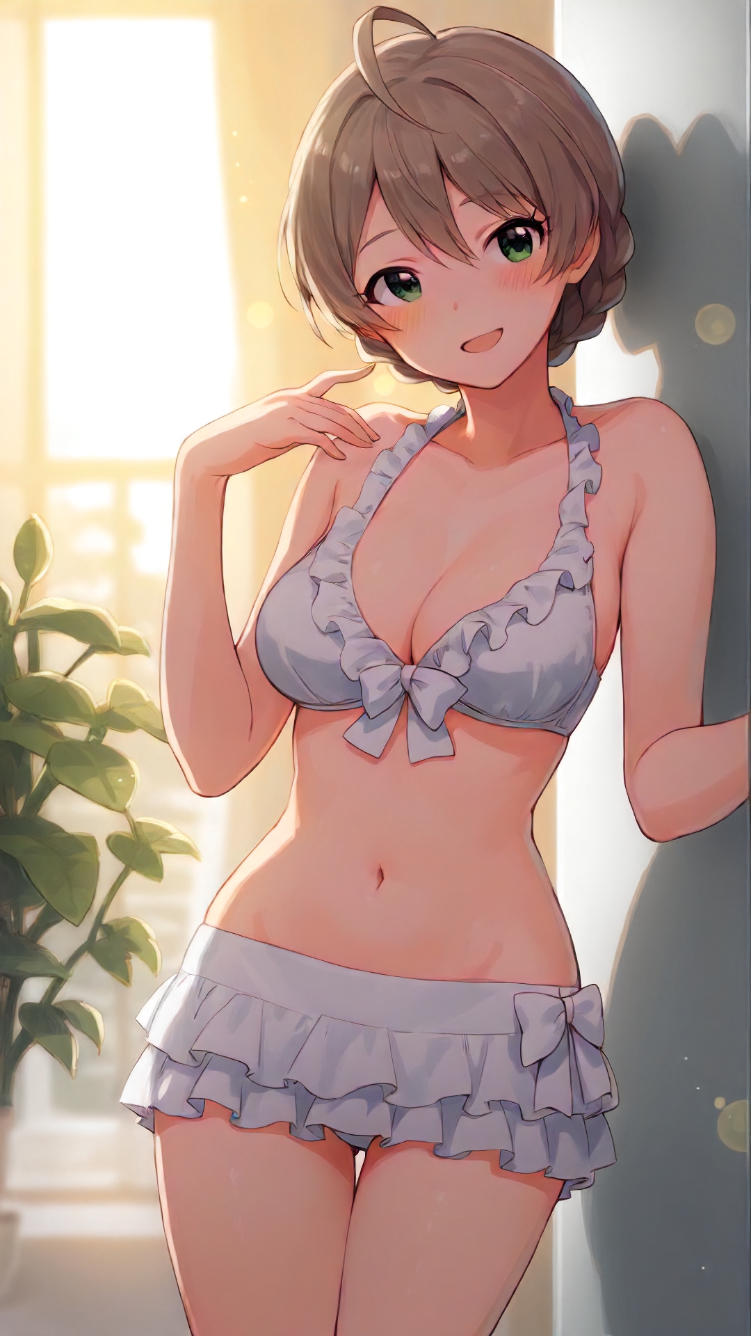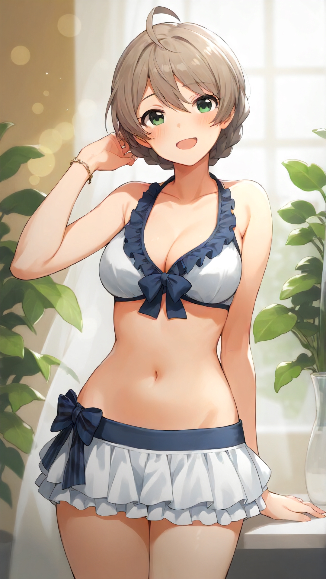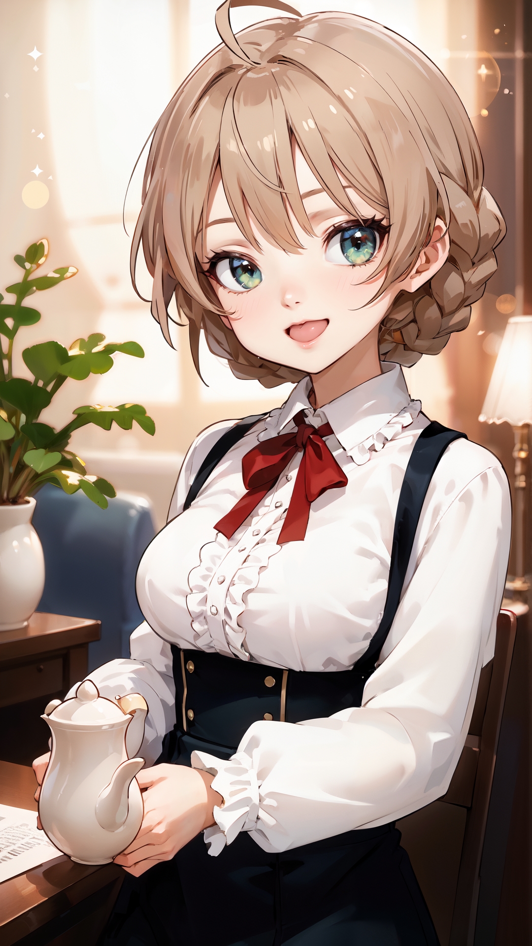 Example prompt : "sakuramori_kaori_idolmaster, an anime girl, 1girl, solo, looking at viewer, smile, short hair, open mouth, gloves, hat, green eyes, braid, white gloves, light brown hair, treble clef, musical note print"