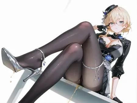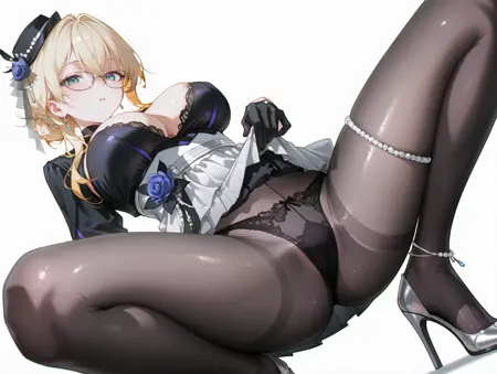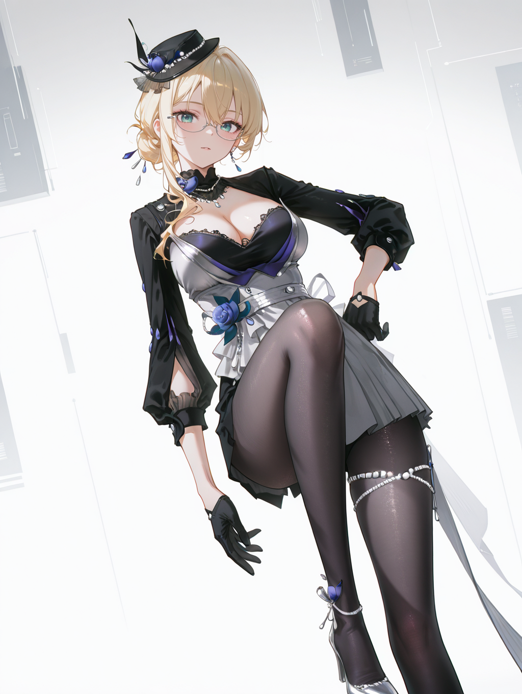 - breasts,glasses,big breasts,gloves,hat,black gloves,looking at viewer,full_shot,cleavage,dress,black headwear,black pantyhose,Shiny pantyhose,Jewelry leg ring,flower,silver high heels,legs,sitting,gloves,black gloves,blue flower,white background,high heels,