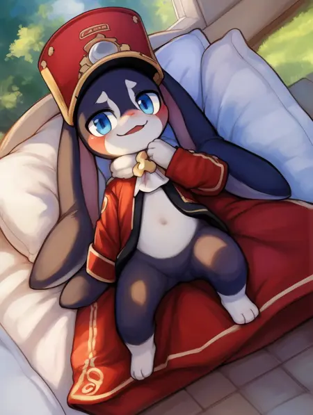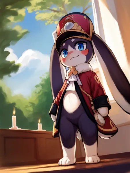 Pom-PomHonkaiStarRailN1, rabbit, red hat, red vest, white face, grey fur, chibi, small body,