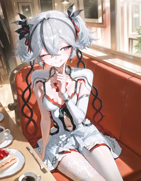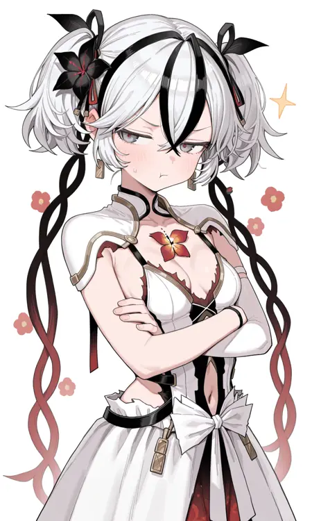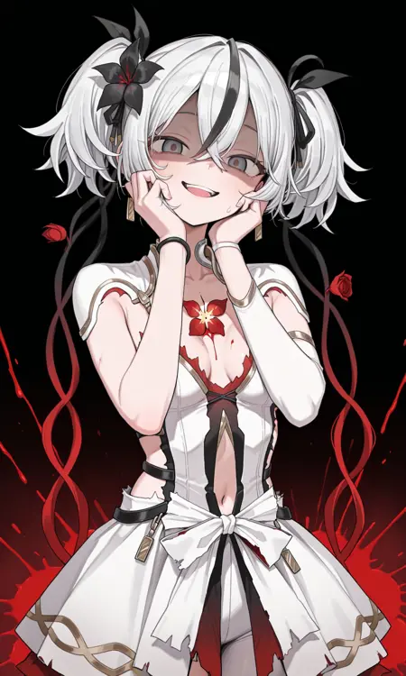 흰 머리, 검은 줄무늬 머리, 짧은 트윈테일, 눈 사이의 머리카락, 십자형 앞머리, 머리카락 덩굴, 회색 눈, 검은 꽃, 머리카락 꽃, 검은 리본, 가슴의 붉은 꽃, 작은 가슴, 등이 드러난 드레스, 측면이 드러난 드레스, 흰 드레스, 배꼽 절개, 한쪽만 떨어진 소매, 흰 바지, 한쪽 다리 바지, 한쪽 다리 스타킹, 흰 스타킹, 프린트 스타킹, 플로럴 프린트