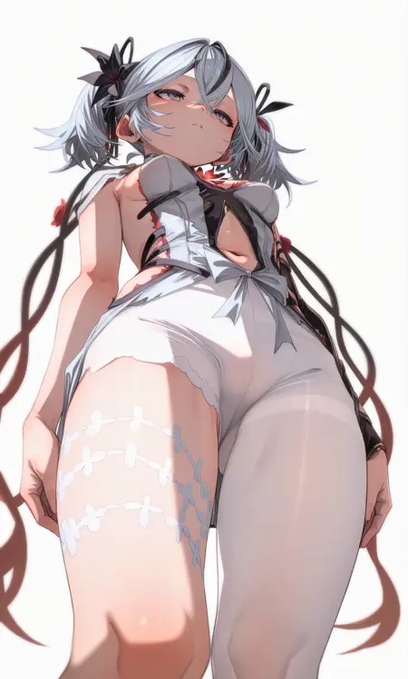 흰 머리, 검은 줄무늬 머리, 짧은 트윈테일, 눈 사이의 머리카락, 십자형 앞머리, 머리카락 덩굴, 회색 눈, 검은 꽃, 머리카락 꽃, 검은 리본, 가슴의 붉은 꽃, 작은 가슴, 등이 드러난 드레스, 측면이 드러난 드레스, 흰 드레스, 배꼽 절개, 한쪽만 떨어진 소매, 흰 바지, 한쪽 다리 바지, 한쪽 다리 스타킹, 흰 스타킹, 프린트 스타킹, 플로럴 프린트