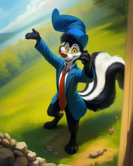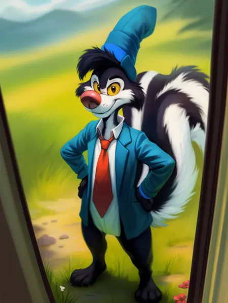 SkunkySkunkN1, skunk, yellow sclera, black eyes, blue jacket, red tie, celinder hat, chibi, small body,