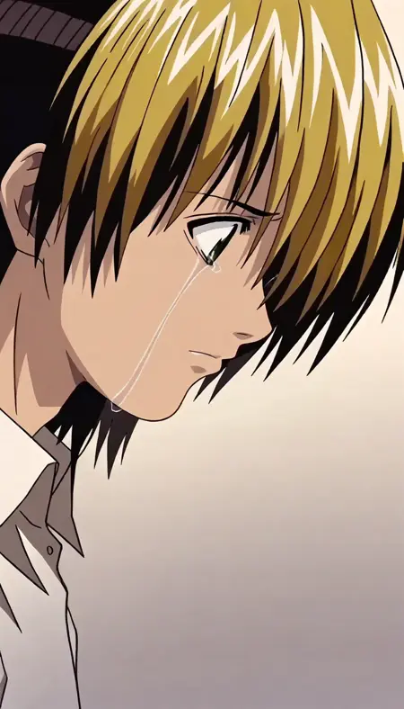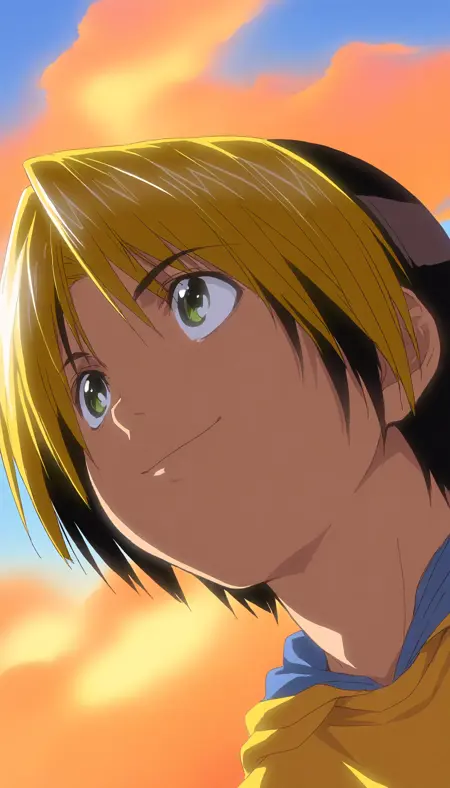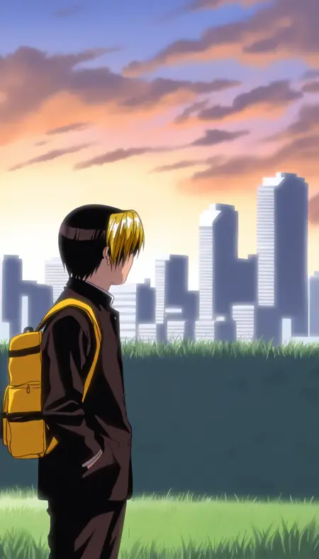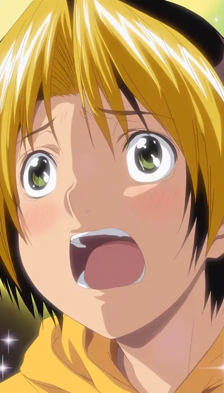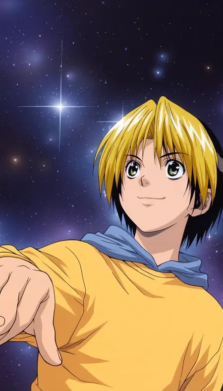 hikarushindo, 1boy, male focus, black hair, gold bangs, green eyes, yellow hoodie, jeans, yellwo sports shoes,