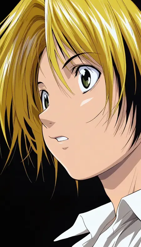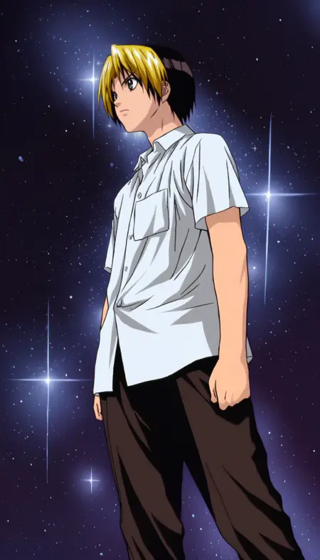 hikarushindo, 1boy, male focus, black hair, gold bangs, green eyes, white collar shirt, black pants, yellow sports shoes,
