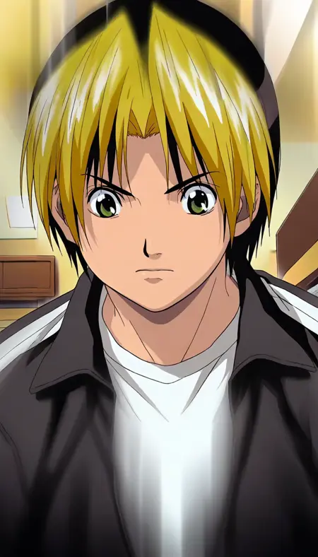 hikarushindo, 1boy, male focus, black hair, gold bangs, green eyes, black sports jacket, black sports pants,