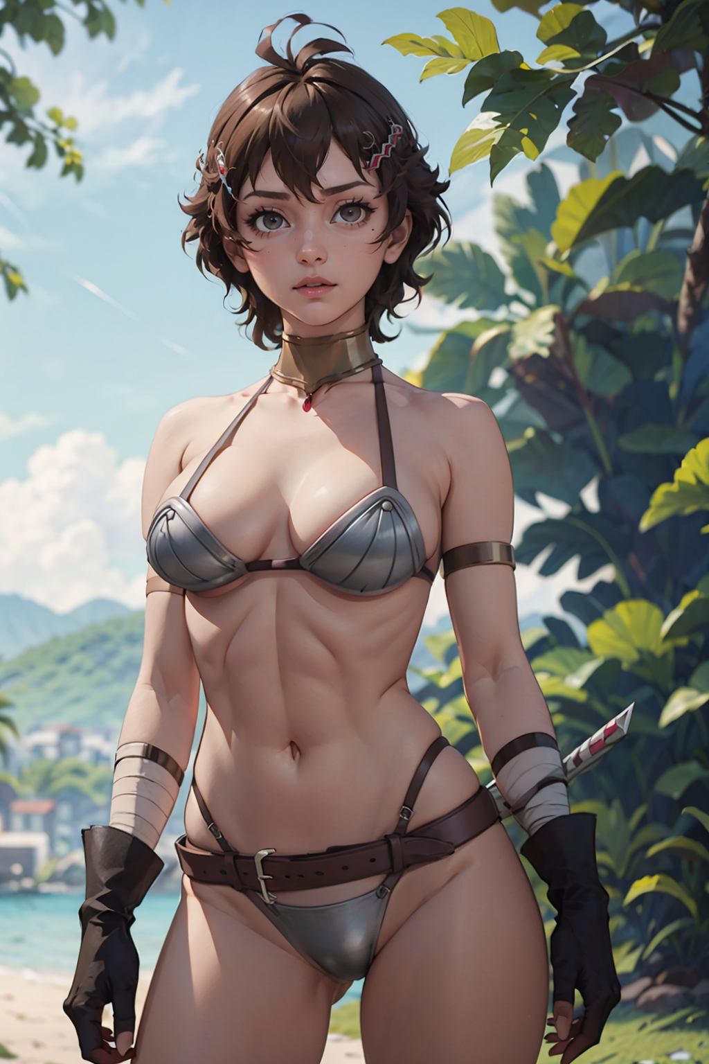bikini armor, gem, hair ornament, hairclip, neck ring, cleavage, bare shoulders, navel, fingerless gloves, swimsuit, black gloves, belt, jewelry, armlet, choker, bandages, collarbone, bandaged arm, sheath, brown belt, necklace, gloves, midriff, obliques, buckle, highleg, armband, belt buckle, highleg bikini, metal collar