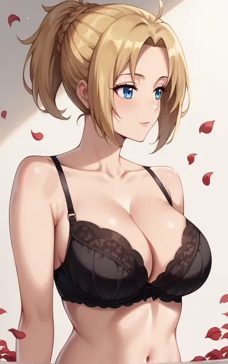 1girl, large breasts, underwear only, black bra, black panties, blue eyes, cleavage, blonde hair, navel, ponytail, collarbone, braid, parted bangs, medium hair, hair pulled back, sidelocks, short ponytail, lingerie