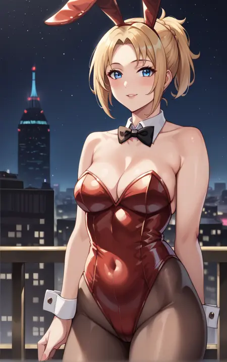 1girl, bare shoulders, blonde hair, blue eyes, bow, bowtie, detached collar, hair pulled back, medium breasts, medium hair, parted bangs, playboy bunny, red leotard, short ponytail, sidelocks, strapless leotard, black pantyhose,