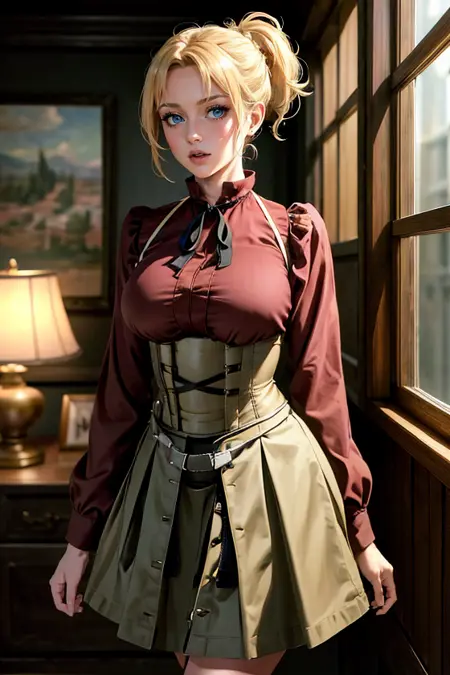 belt, black ribbon, green skirt, long skirt, underbust, white corset, white sleeves, shirt, neck ribbon, long sleeves, vest, skirt, corset, red shirt, ribbon, turtleneck, crop top,