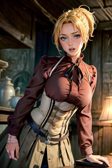 1girl, blonde hair, blue eyes, hair pulled back, medium hair, parted bangs, short ponytail, sidelocks, large breasts, long hair, scrunchie,
