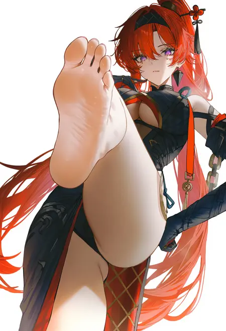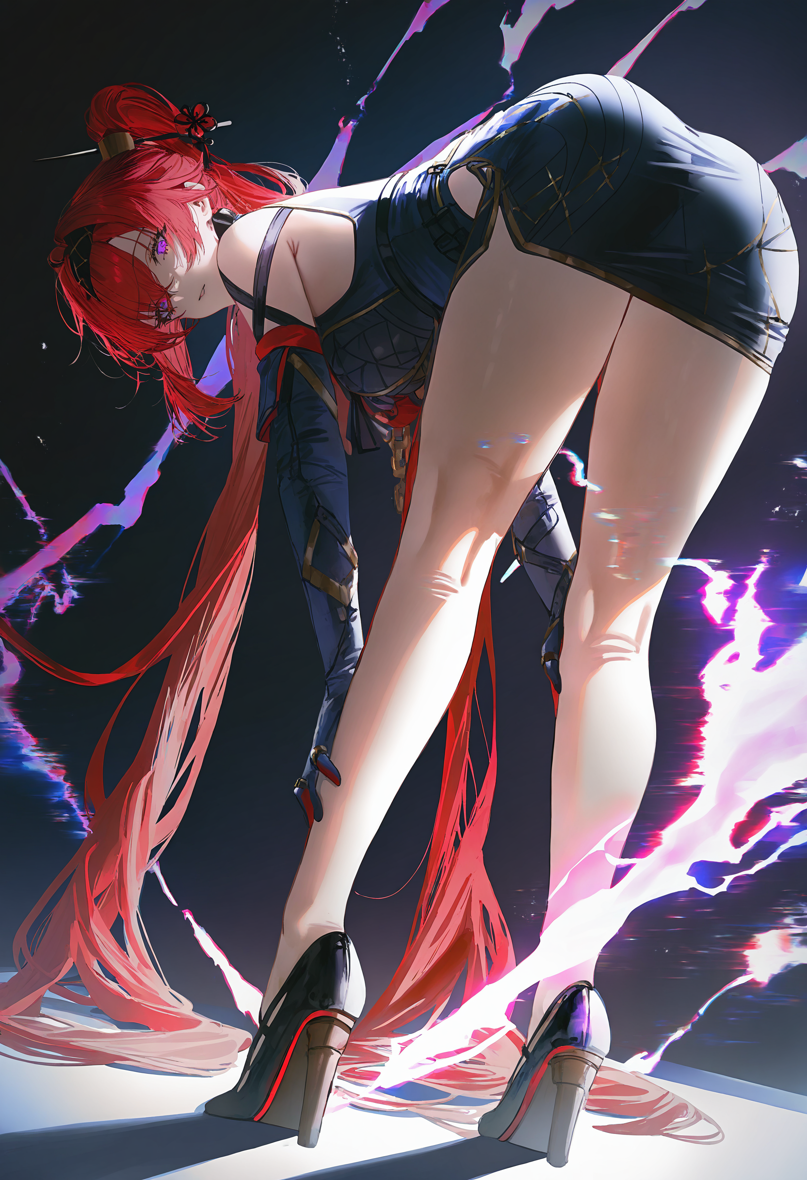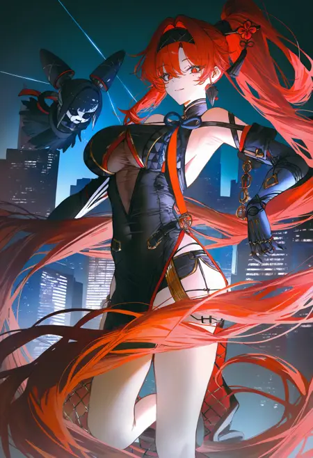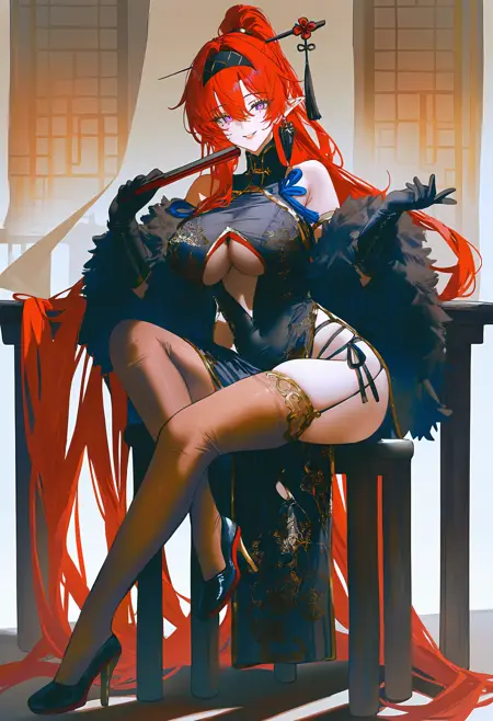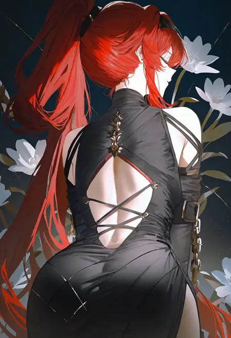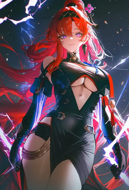 触发词: very long hair, red hair, looking at viewer, 1girl, purple eyes, solo, ponytail, hair ornament, gloves, mole, bare shoulders, black dress, jewelry, smile, earrings, black hairband, pointy ears, standing