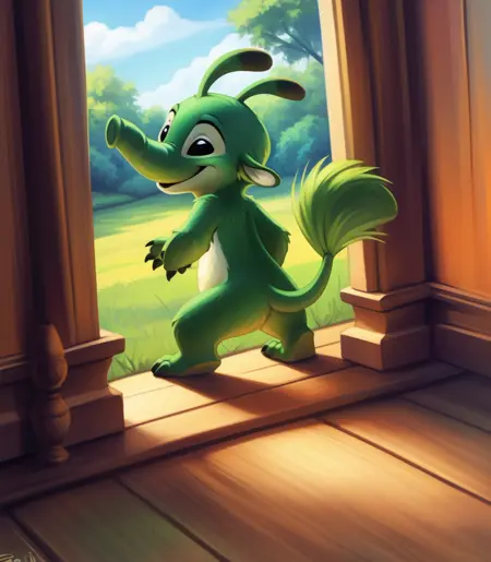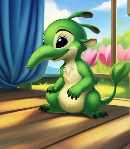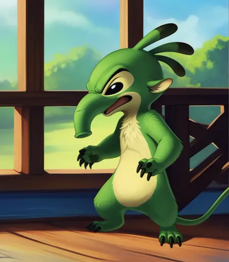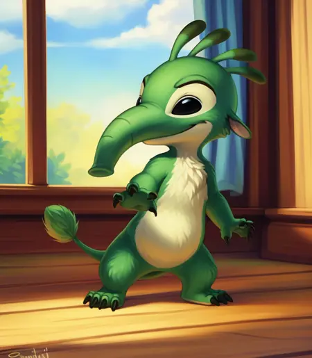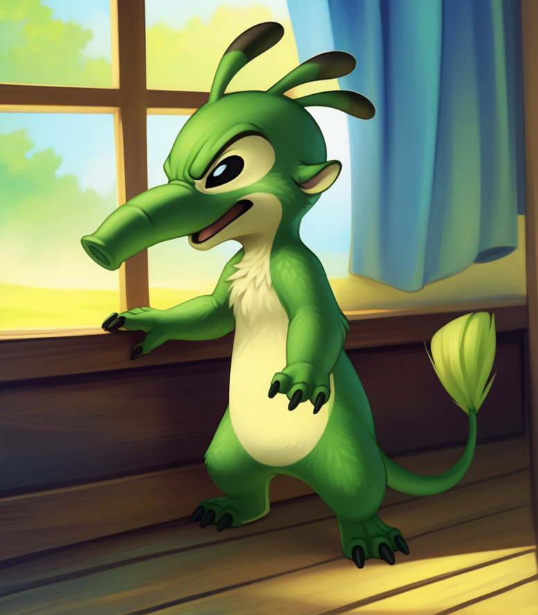 FelixAlExpN2, Ant-eater, green fur, Black eyes, trunk-like, black claws, chibi, small body,
