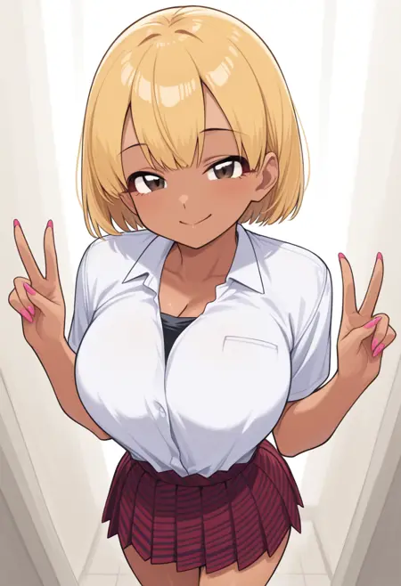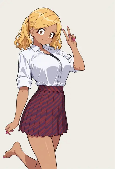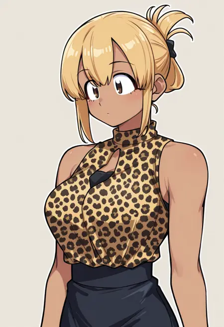 School Outfit : school uniform, pleated skirt, striped skirt, collared white shirt, breast pocket, shirt tucked in || Optional : Blue Jacket || leopard print scarf, scarf,