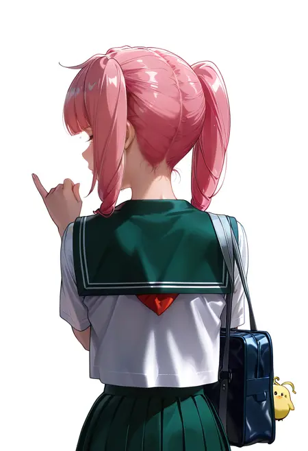 학교 유니폼, serafuku, 녹색 해적색 칼라, 넥커치프, 흰 셔츠, 둔한 앞머리, 학교 가방, 녹색 치마,